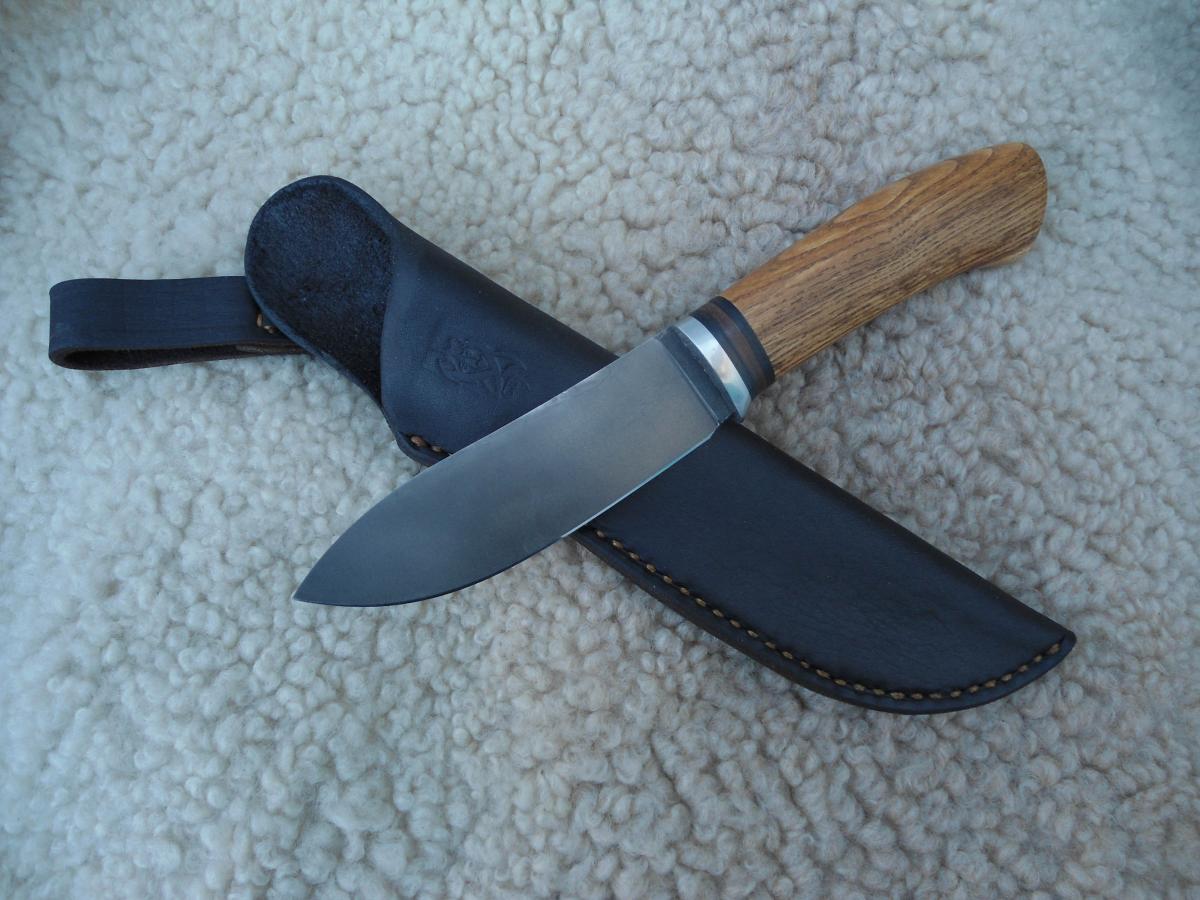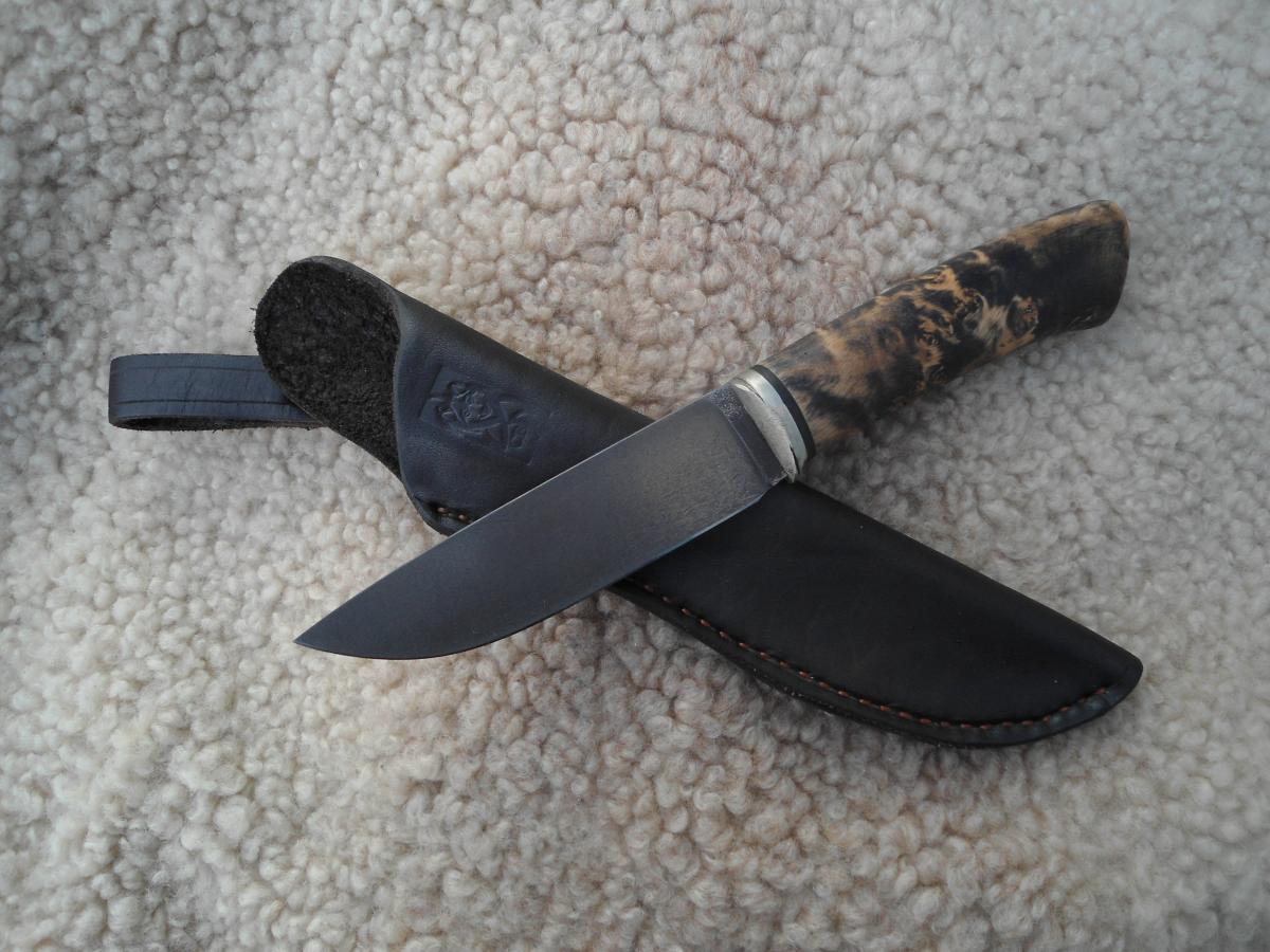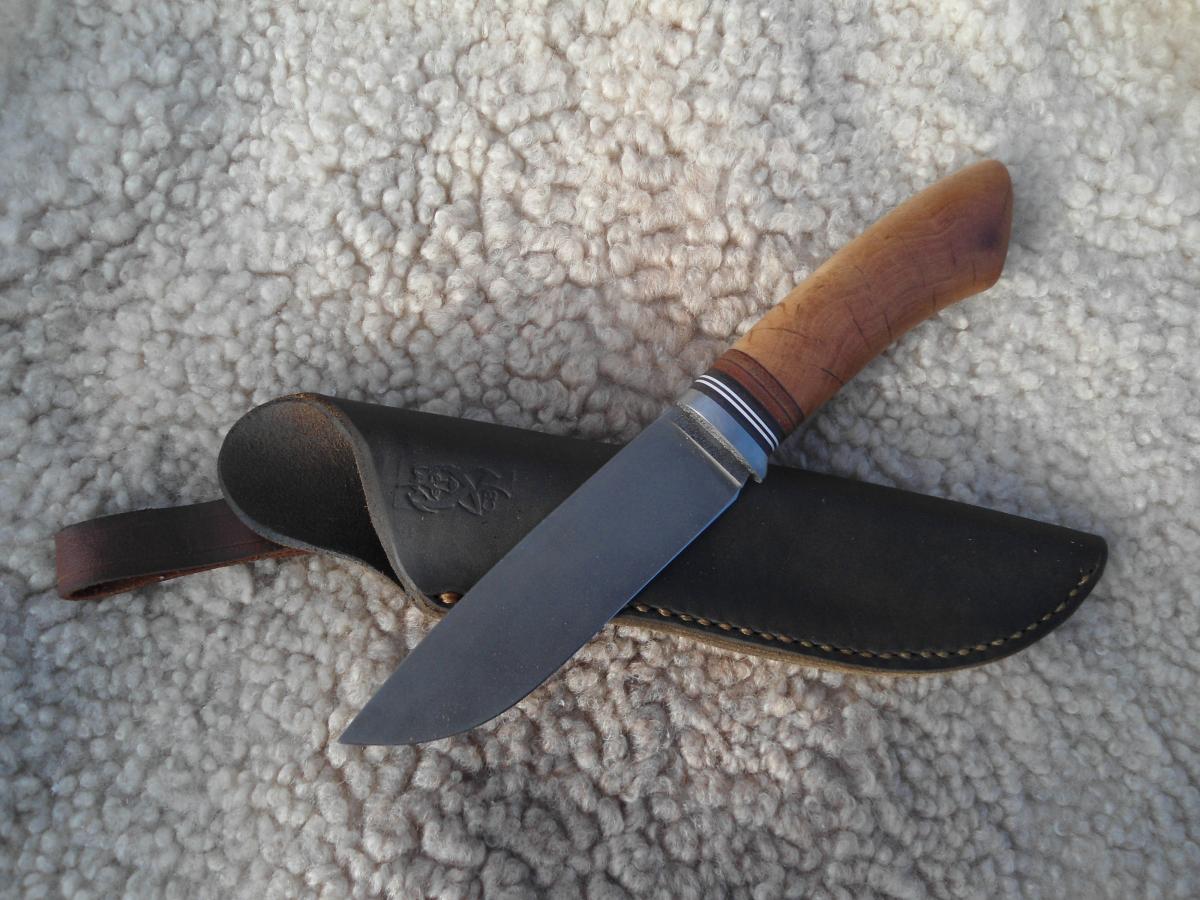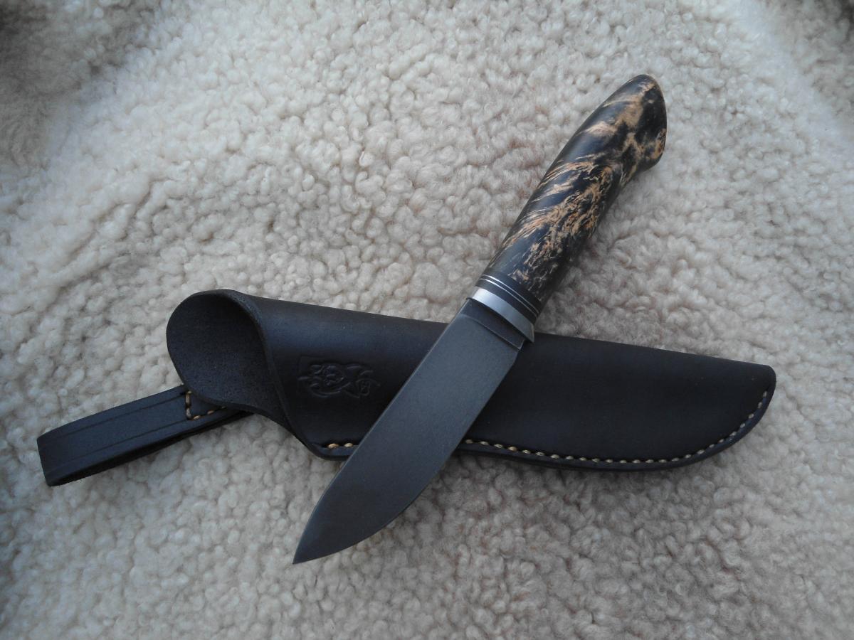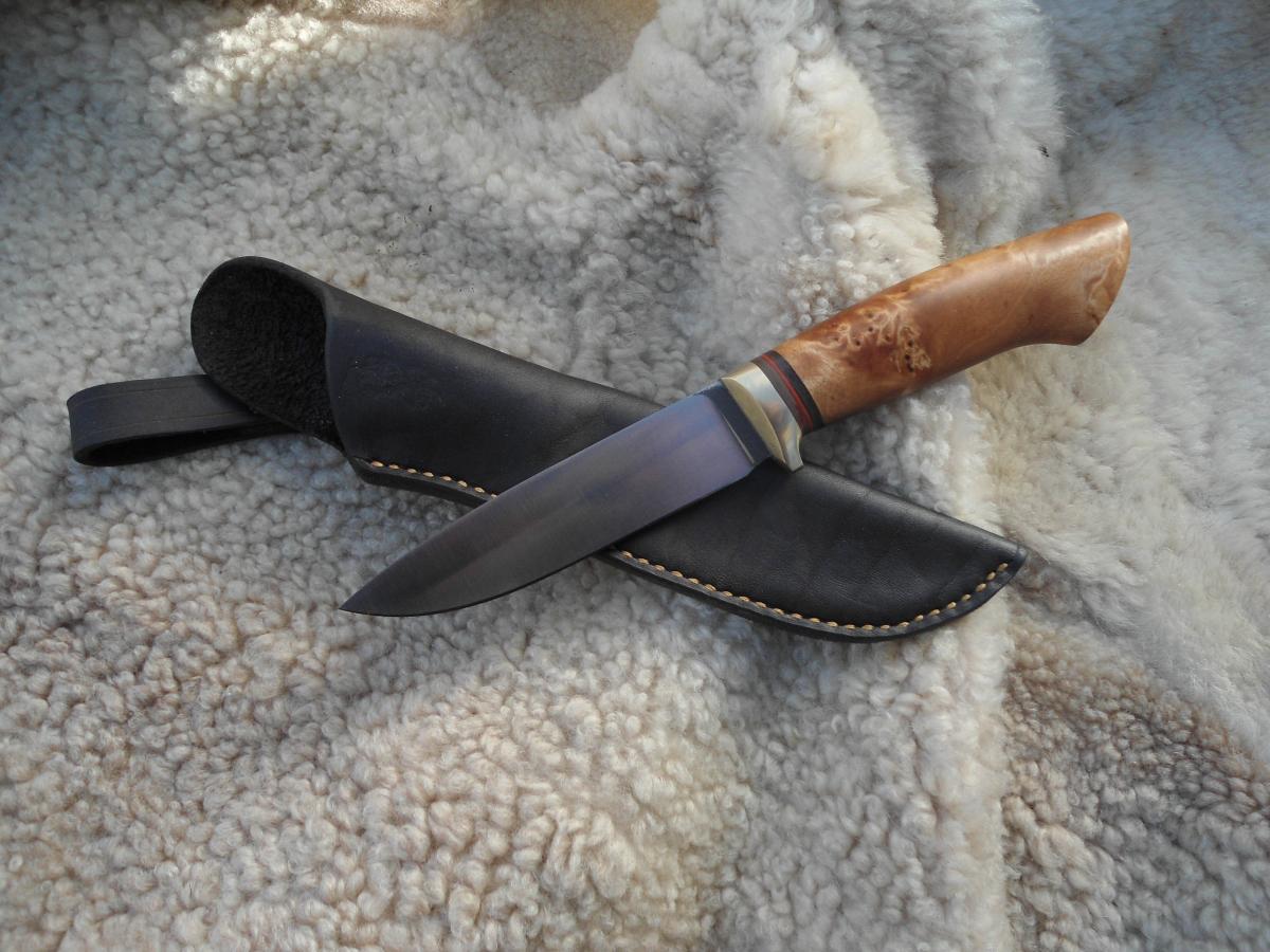 антипотеряшная,кап березы пропитан Тунговым маслом 108х21х14мм.Ножны чепрак шведский растительного дубления. Подвеса нет,сказал не нужно в кармане носить буду)))