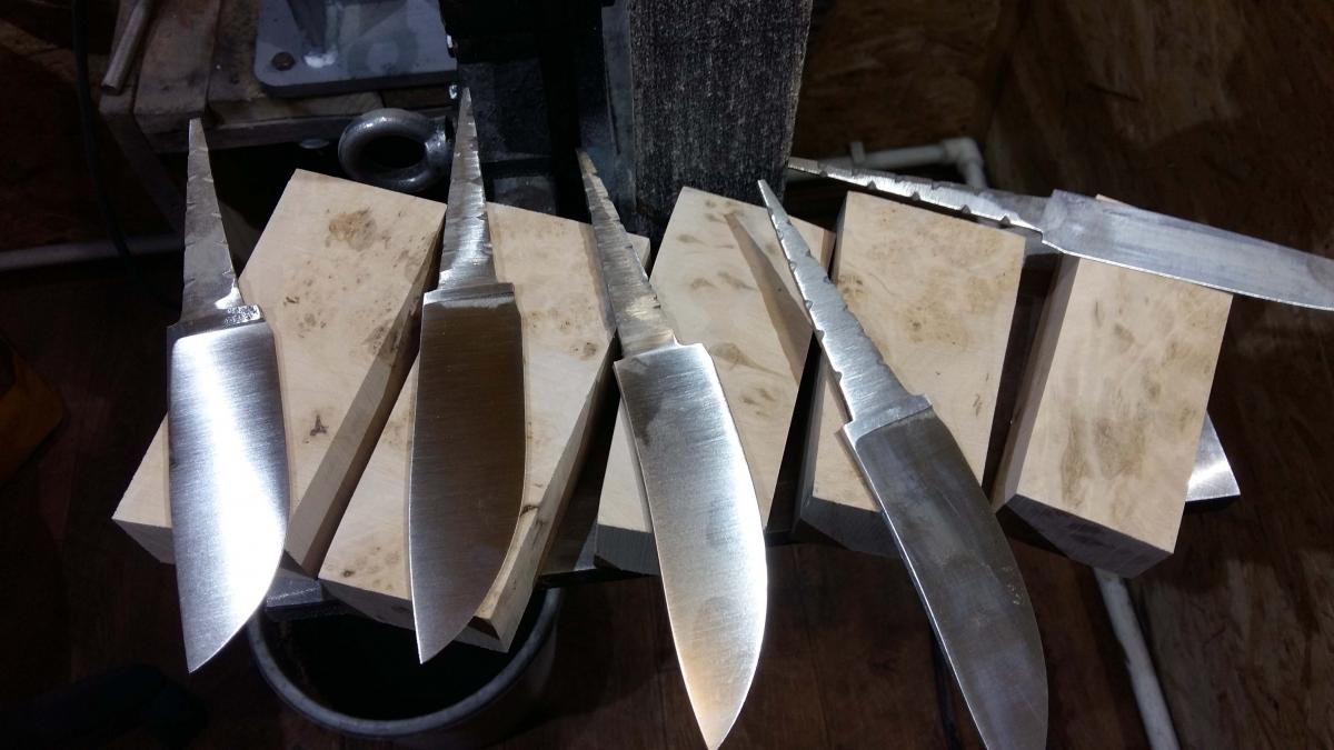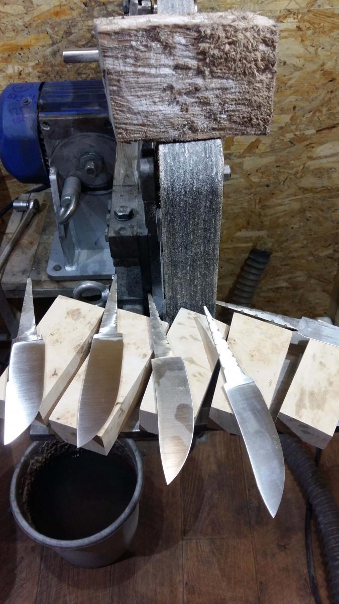 Хотел сегодня еще за капом съездит да снег пошел. В ожидании хорошей погоды взял пять брусков уже готовых да клинки что на неделе отслесарил. С помощью Гриндера ободрал их в нужный размер,а были такие же что на ленте стоит.Для каждого клинка свой брусок уже подобрал в процессе. Пойду к склейке готовить.