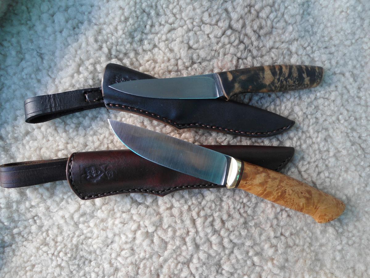 Пара сделанных на этой неделе.Коричневый, клинок ДИ-90мп 116х30х4,7мм,рукоять латунь,кожа,пластик,кап березы 122х28х16мм. Черный,клинок цпм с35вн 112х27х2,5мм,рукоять мельхиор,кожа,кап березы тонирован в черный 125х27х16мм.