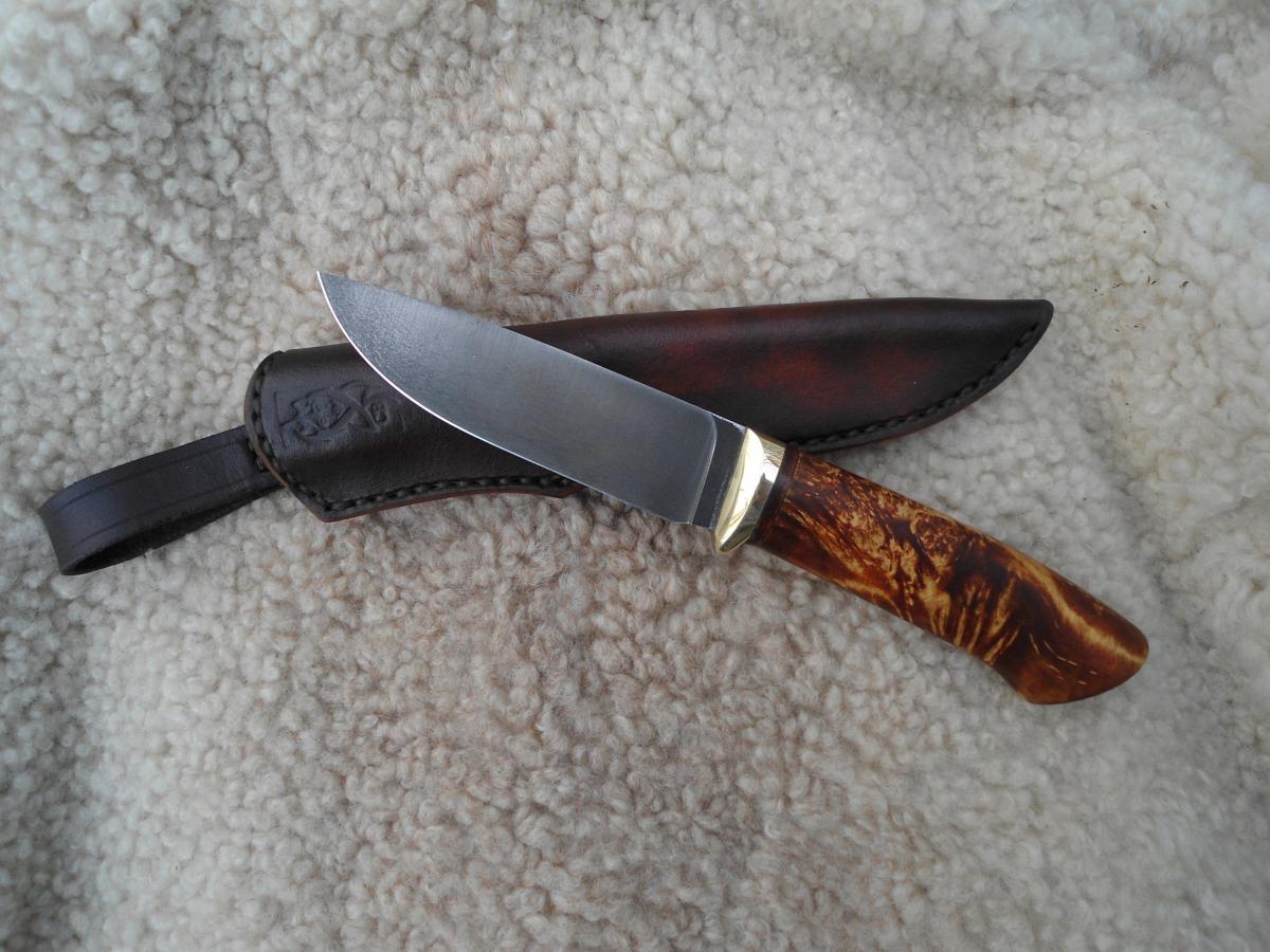 ТТХ клинок 143х29х3мм спуски прямые сведен примерно в 0,2мм протравлен в ХЖ.Рукоять 135х27-29х18-21мм латунь,береста,кап березы слегка подтонирован в коричневый. Монтаж всадной на эпоксу,длина хвостовика 110мм. Ножны чепрак растительного дубления,подвес свободный на правую сторону.Кожа,нитки,краска все от Мксима(monia)