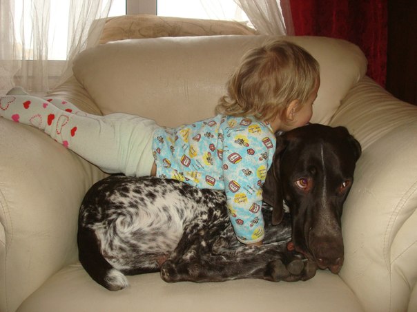Написано, про ее спокойный характер, ладит и разрешает все, что угодно с собой вытворять детям, а вот про курцхаара наоборот.