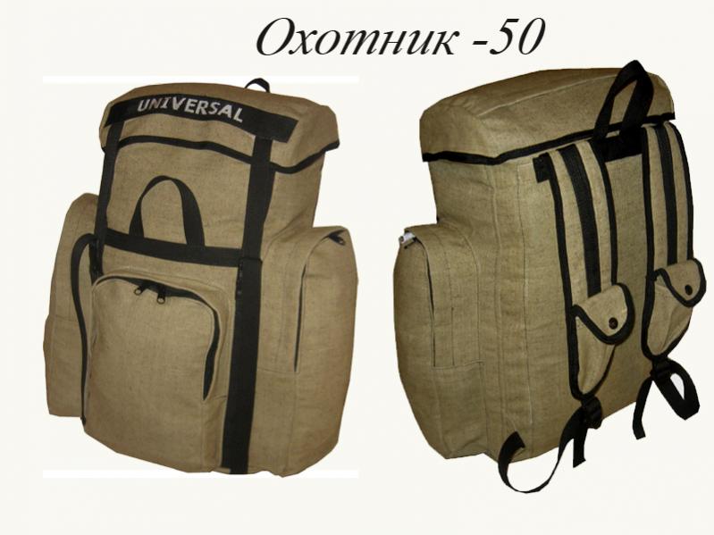 Рюкзак "Охотник-50" Прочный рюкзак, изготовлен из нешуршащего брезента-550г/м, с в/о пропиткой. В «спину» и лямки рюкзака вставлена пена 10 мм. Имеет три объёмных кармана, а также плоский карман на крышке (все карманы на молниях). На плечевых лямках имеются объемные карманы на кнопках. Крепления лямок и строп дополнительно усилены заклепками. Ручки рюкзака укреплены стропами. Крышка закрывается при помощи двух пряжек – фастексов.