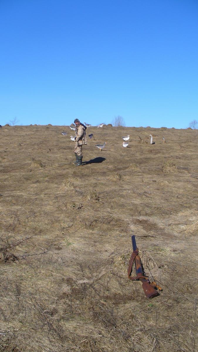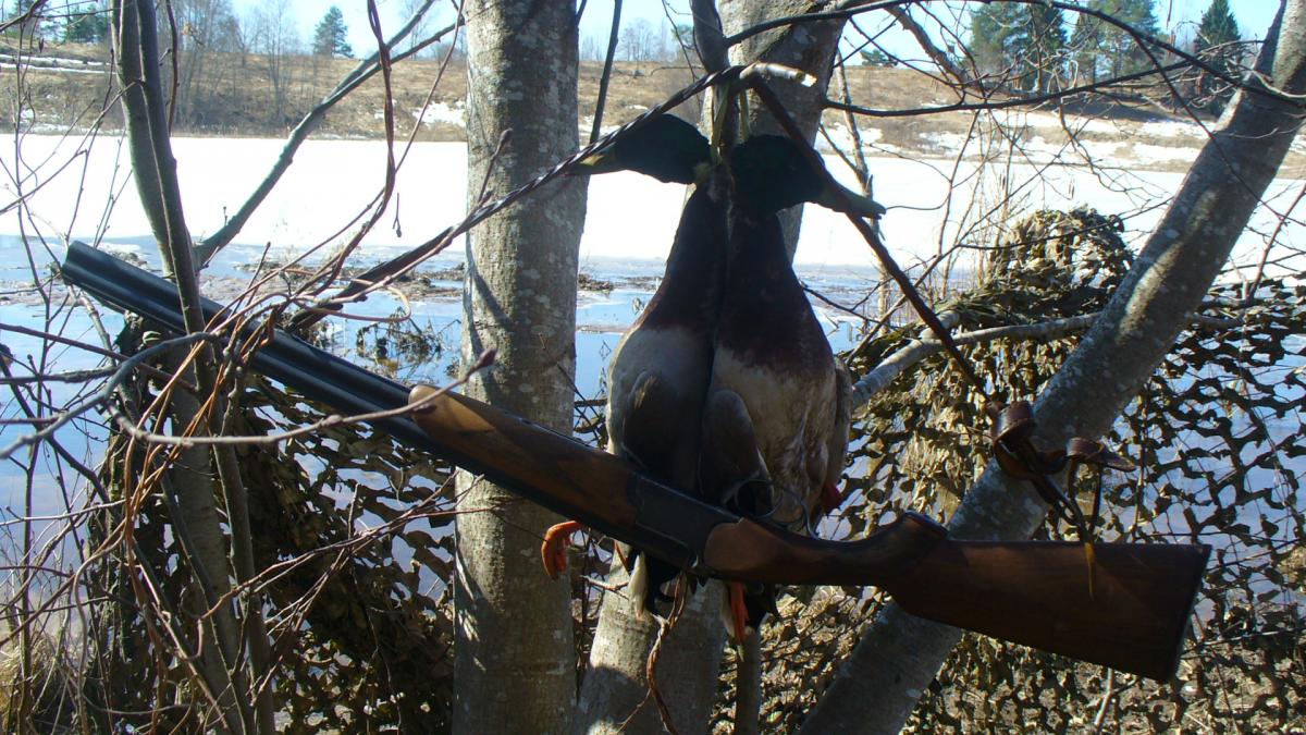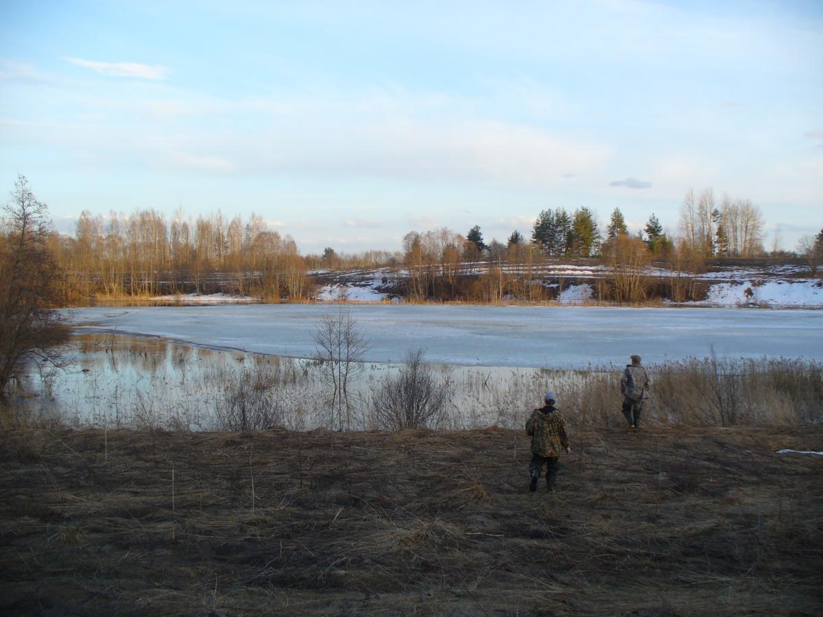 ,вечером снова тяга но уже по веселее, Аркадий пошел звать селезня и он отзывался только почему то не у него, а с нашей стороны, казалось что вот вот он выйдет сам пешком к нам на поле но в ту заводь приплыл бобер и похоже выгнал селезня, мы его уже не слышали, а бобер весь вечер плюхал хвостом, а может бревна таскал не знаю но было очень шумно, вечером к нам приходил ежик, говорят вроде рыбу кушал ,утром пошли за селезнем, взяли пару штук, я конечно слегка так искупался ,проклятый бобер слишком тонких палок через ручей на пилил, так что в валился как надо, пошел домой сушится ,переодически летел гусь не большими стайками и высоко и вечером последняя перед отбытием тяга, видели порядка десяти штук, Вадим добыл пару и Аркадий одного ,а на до мной на выстреле не каплет на охоте пользовались большей частью манками Дмитрия (Ларионыча), а я еще и его патронами ,за три дня охоты четыре селезня и штук семь вальдшнепов, вообщем то для тех широт было достаточно холодно ,весна все таки поздняя ,