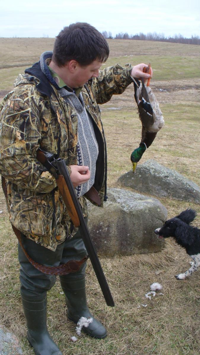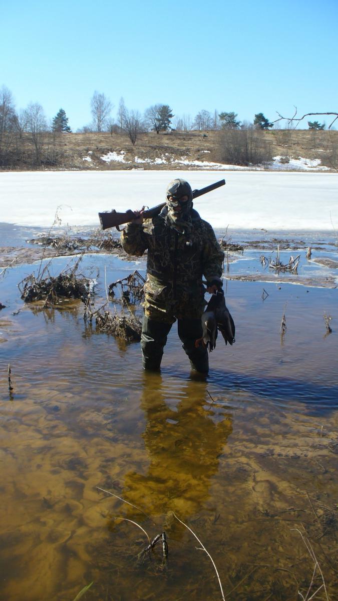 Собственно говоря Псковская область ,что б было понятно, Вадим (Наян), был уже там, а мы выехали к нему в пятницу 19 числа, с Аркадием (ark71) ,хорошо так выехали ,а вот доехали кое -как ,машина слегка подвела но не об этом речь, железо оно и есть железо, спасибо что Вадим был рядом, хорошо то что хорошо кончается, вообщем по приезду пошли на разведку, снегу в лесу было не по графику ,вечером посмотрели тягу ,видели трех штук, одного пытались за дуплетить шапками но не бейсболка Вадима не мой чепчик ему не понравились, зато реакция у него была бурная, первый день охоты пошли за селезнем, счет открыл Аркадий, собака категорически отказывалась лезть в холодную воду но с уговорами принесла дичь Вадиму, все самое лучьшее хозяину, кто бы сомневался