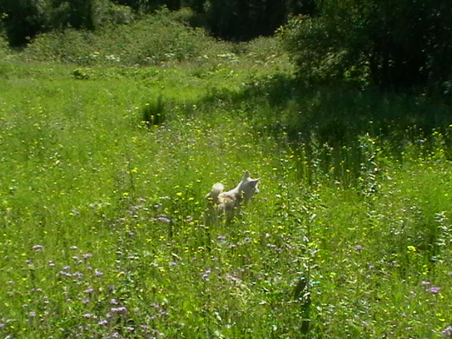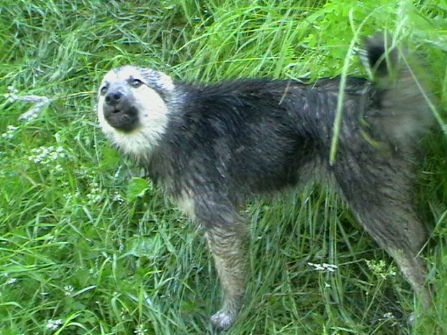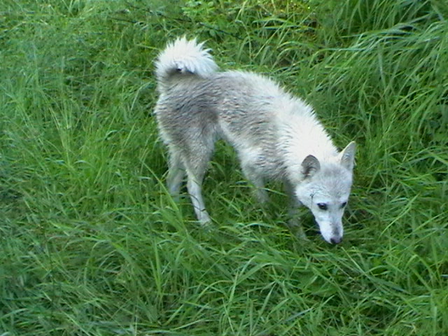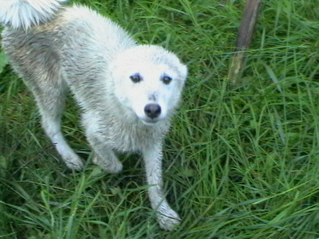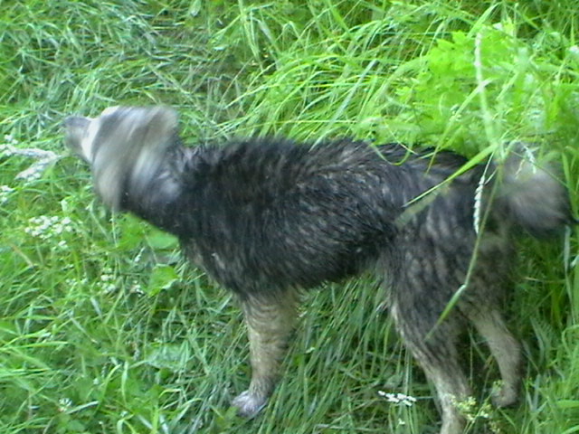 ночью был сильный дождь и трава мокрая,но собакам наравится.