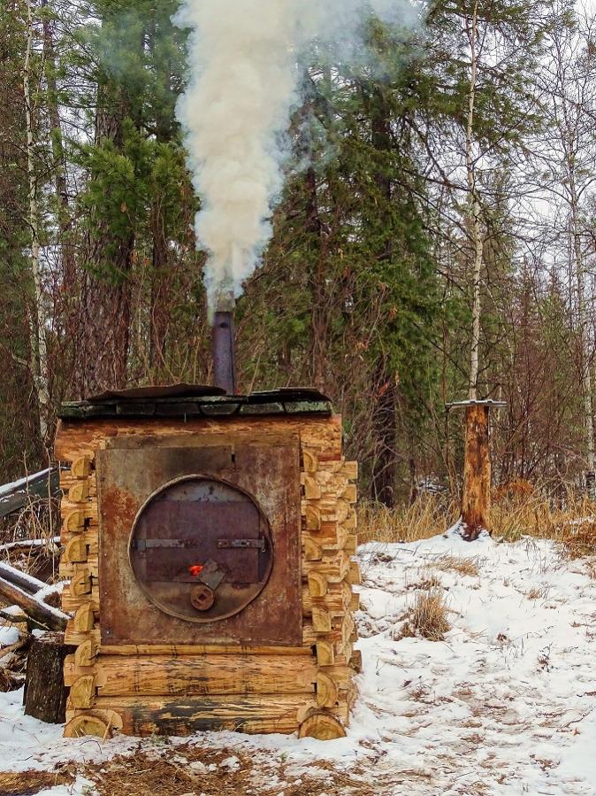 Простая металлическая бочка, снаружи засыпанная щебнем и камнями. А сруб это всё держит в куче, чтоб не развалилось. Не тащить же в такую даль цемент, да и глины для кладки печи, скорее всего там тоже не найти.А внутри как устроена?