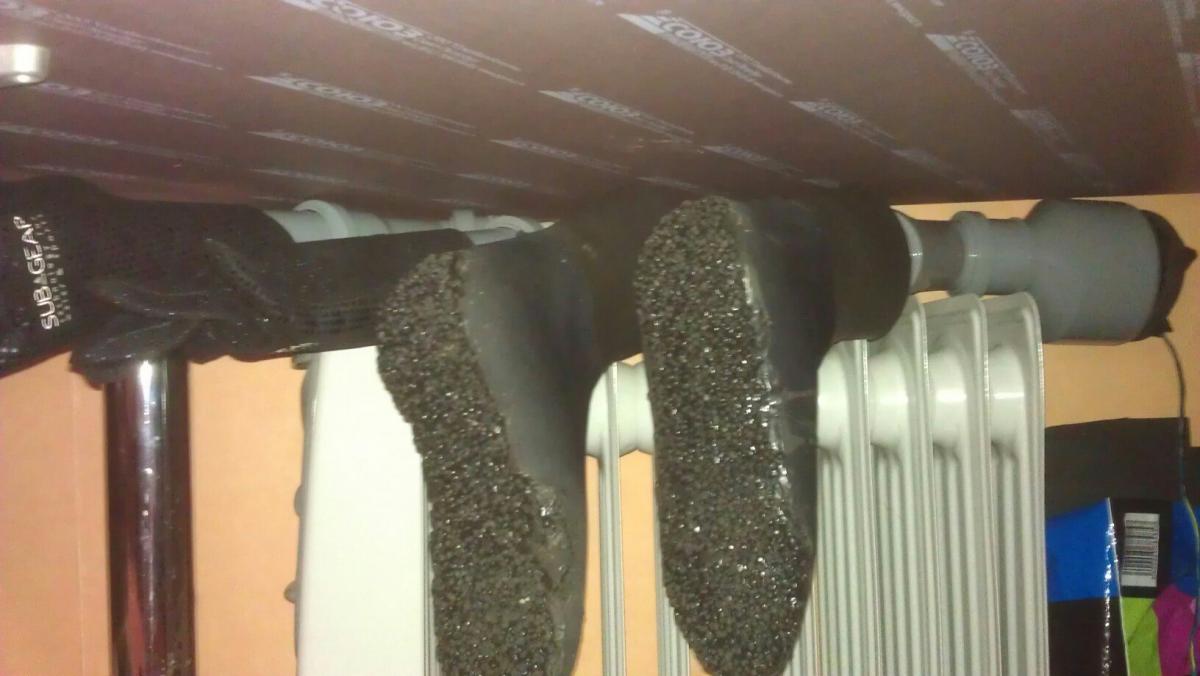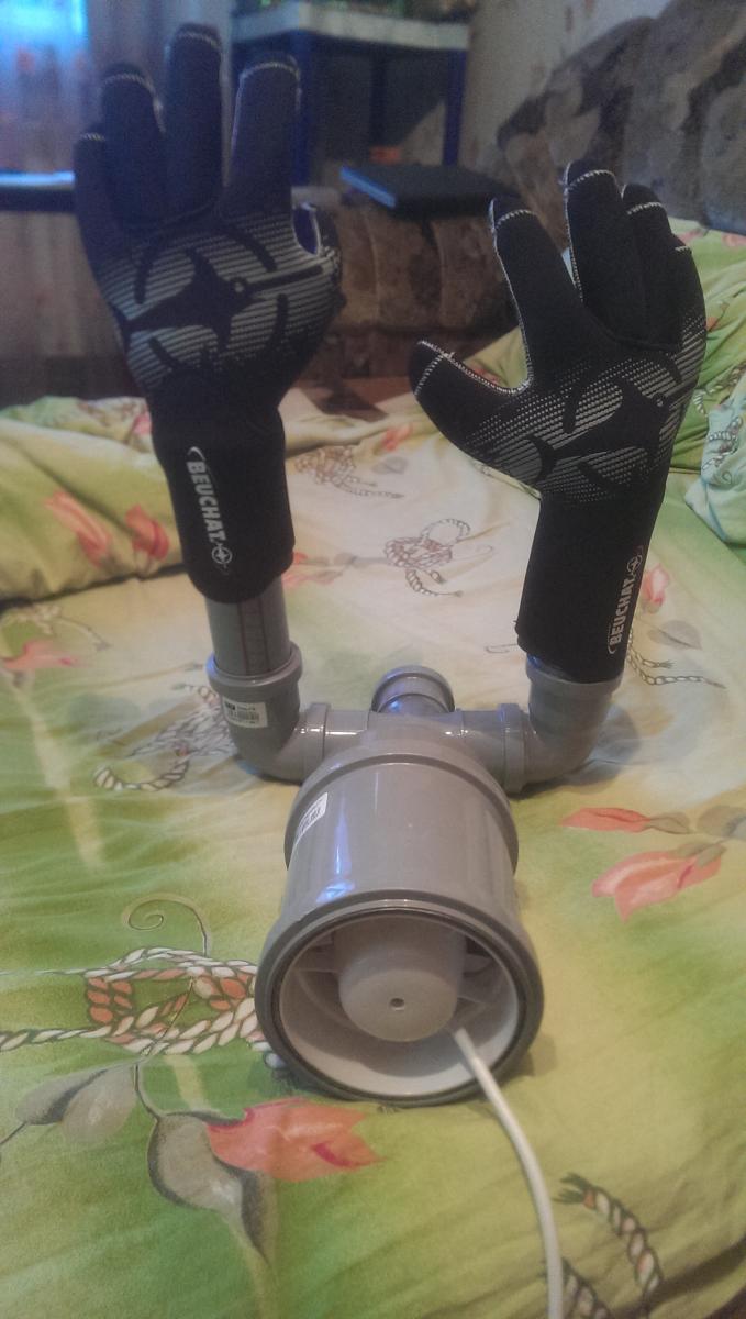 А мой ещё пока на стадии прототипа, я не завершил испытания т.к. этот девайс супруга заставила выключить через 15 минут тестового полёта - за неделю лёжки на холодной батарее носки малость подспрели, а раснозящийся в процессе вентиляции амбре не давал ей покояУтром мокрые носки и перчи насаживаю на трубы и включаю аппарат. Вечером все сухо.
