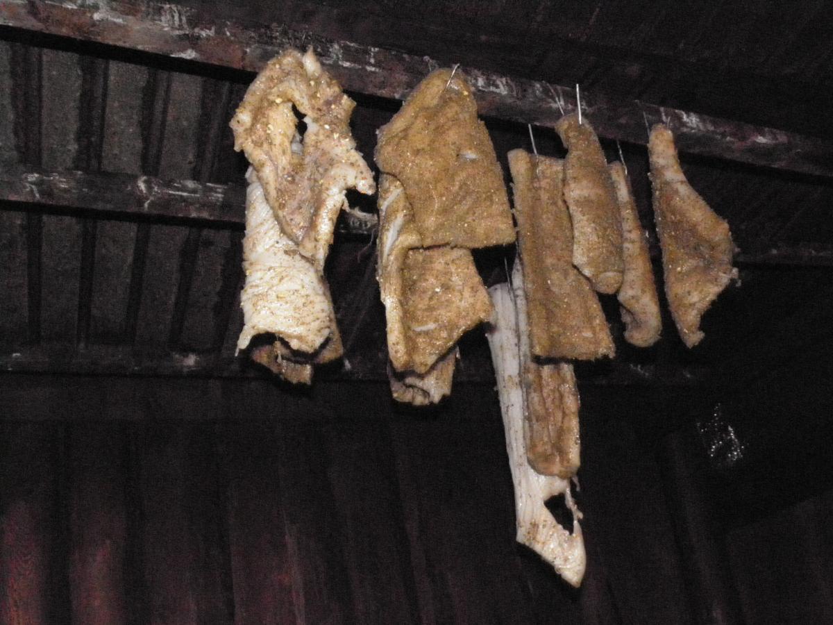 А ещё холодным копчением коптится сало, в данном случае - тюленье. Сало сначала солится, натирается приправами.