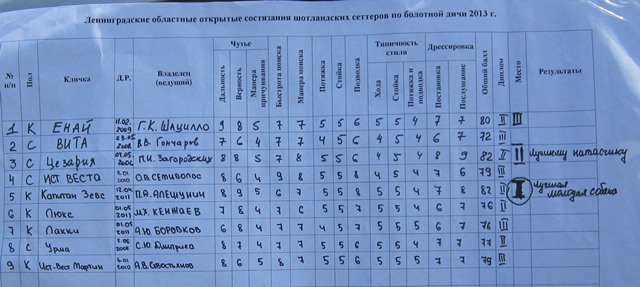 Итоговая таблица. Считаю, что показали великолепный результат, ни одной снятой собаки, все были готовы, в той или иной степени, но готовы.Пять дипломов второй и четыре третьей степени, причем Полевого Победителя от участника, занявшего девяятое место отделяют всего 10 баллов, очень плотно!