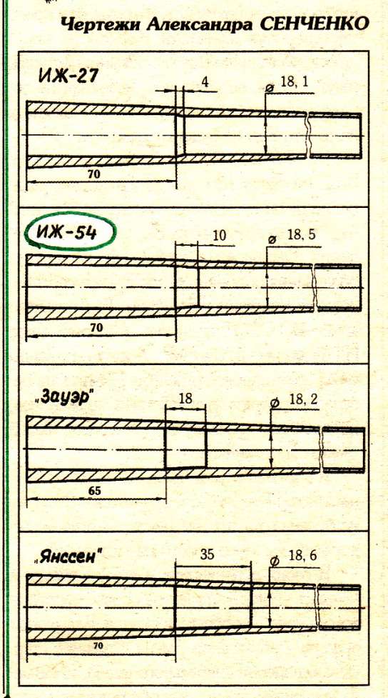 На Меркеле 1912 г.выпуска сужение идет по всей длине ствола, а сам чек сужается незначительно, но кучность- мама не горюй! Я сам начинал охотиться с ним и мазал со страшной силой. Потом сделали отливку по стволу и выяснилась вышесказанная картина. Еще бывают чеки с предварительным расширением перед дульным сужением, но это очень редкое явление и сейчас не используется. И есть классные стволы на полевую и болотную дичь- раструбы. Стрелять можно хоть с пяти метров- дают широкую осыпь на короткой дистанции.