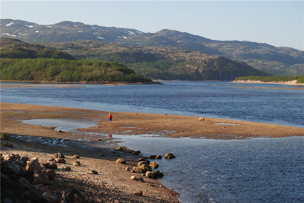 Нерестовая река. Титовка. Мурманская область. Ветер дул такой, что сдувало с насыпи. Добраться до деревни Титовка можно только по воде, около реки бросать машину - и либо вброд, либо вплавь ))Микроскопического меня можно разглядеть во время отлива. На следующий день вытащили из реки брековскую сеть, перегораживавшую русло.