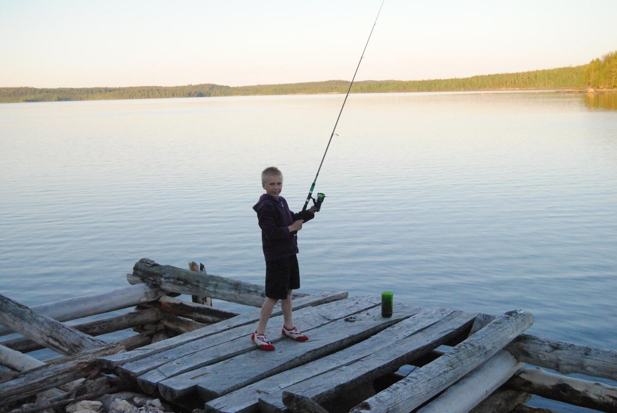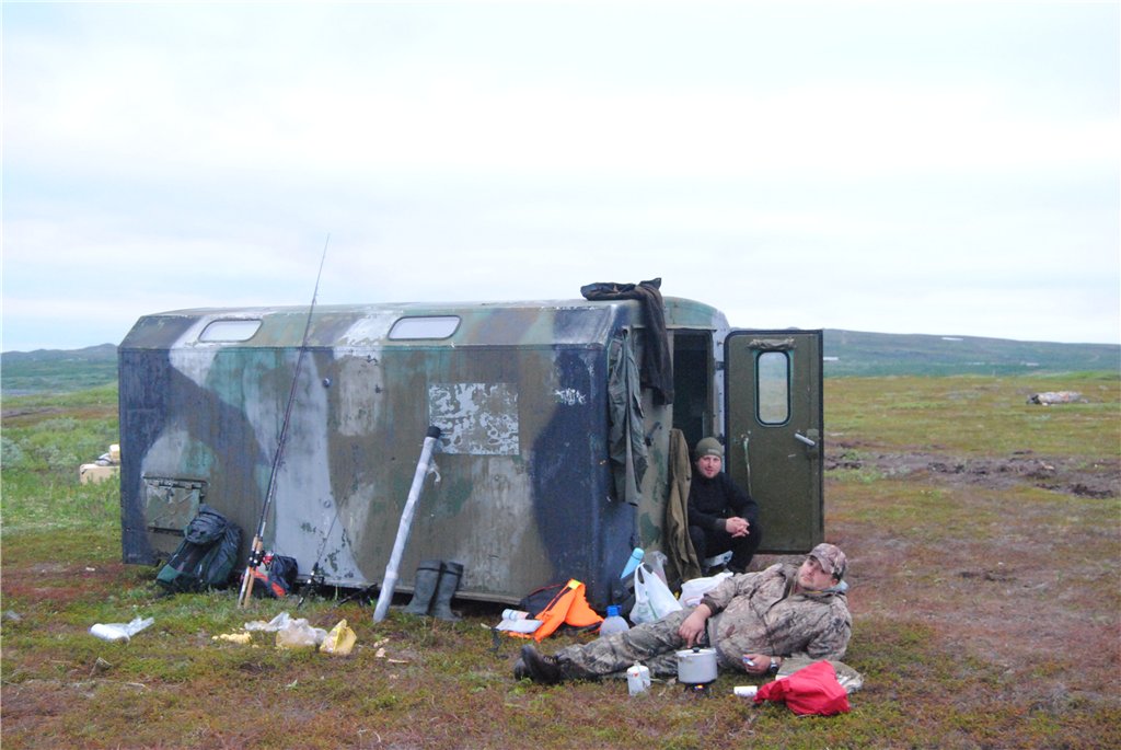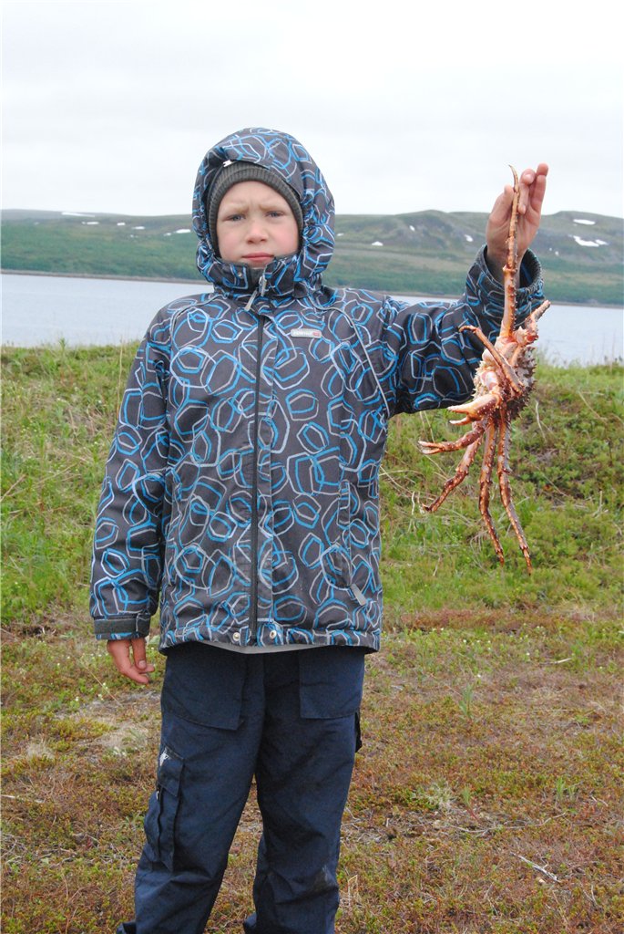Дальше была долгая история спуска под дождём и ветром, час до машины, и несколько часов до места нашей стоянки, которое оказалось просто чудесным. На побережье Рыбачьего находится база "Большое Озерко", которое открылось только в прошлом году. Её хозяин, с которым мы тут же познакомились, Вячеслав, был на месте, и любезно принял нас - так как похолодало, а саму базу мы не бронировали, (да и ценник там немалый, полторы тысячи с человека в сутки за место), он выделил нам кунг, где мы благополучно спрятались от +5 и дикого ветра. Сухо, тепло, не дует - что ещё надо? 8) Дал совершенно бесплатно, от чистого сердца. И вообще - показал себя тонким, умным и очень интересным человеком, который отлично знает историю этих мест, где люди жили, оказывается, аж больше 1000 лет. Пока мы разбирали вещи, хозяева накормили сына супом, а нам дали исчерпывающую информацию по рыбалке)) Внезапно сын где-то побегал и вернулся с диким и опасным жывотным))