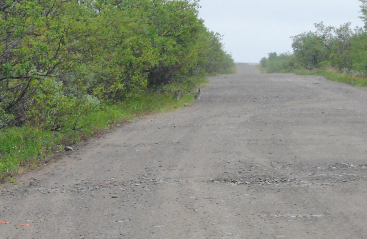 А вот так на полуострове Средний бегают зайцы, прям сидят на дороге, и нагло троллят иногородних охотников
