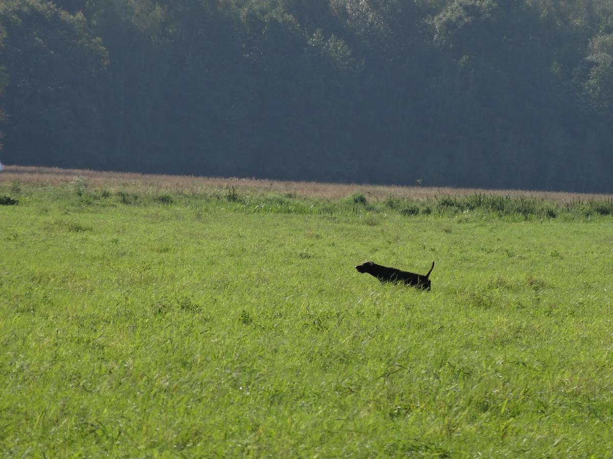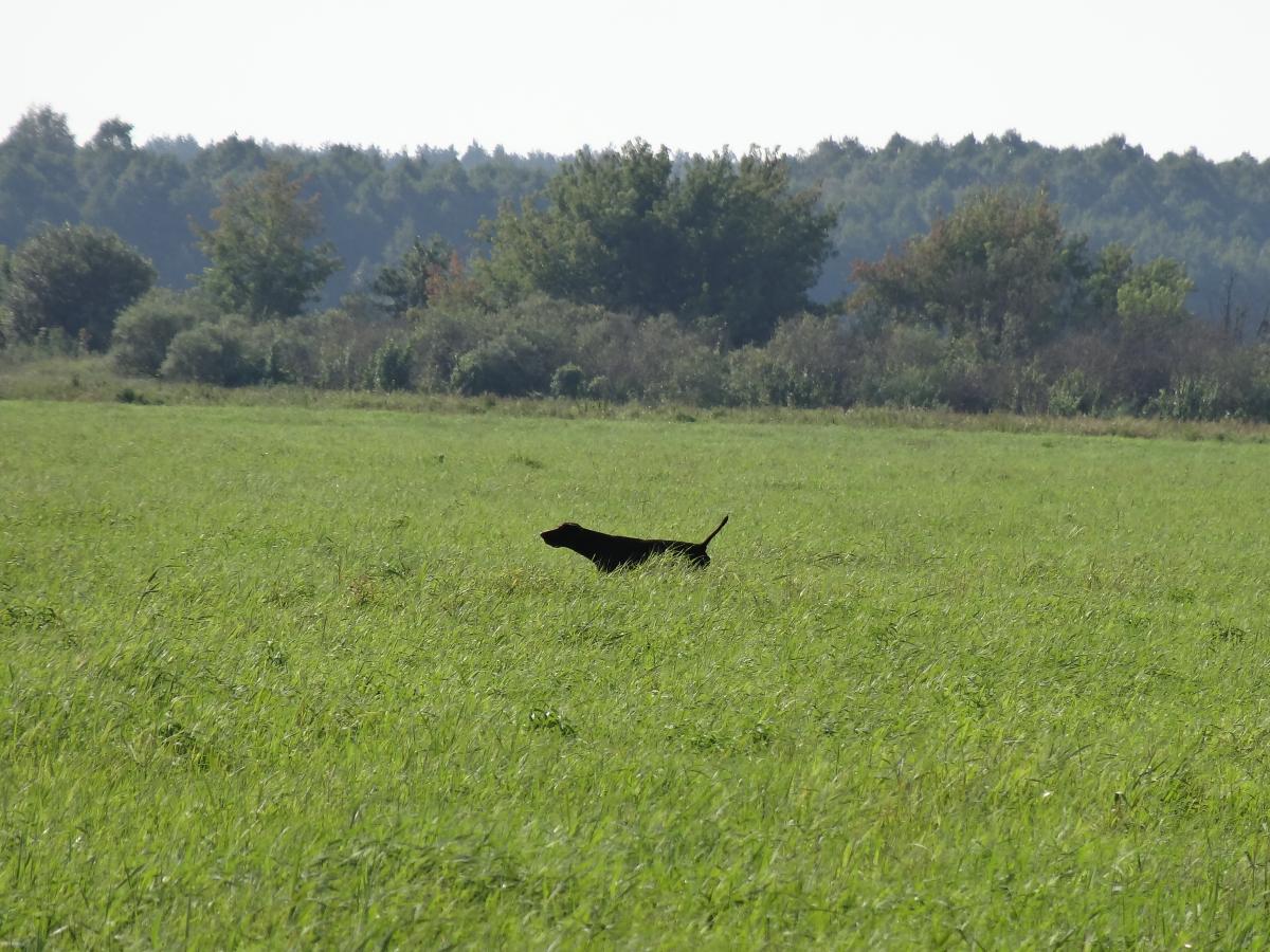 Сухо в этом году... Дупеля нет, бекаса нет... А вот с коростелем все супер! Ну не пропускать же первое поле! Вот собственно 9-ти месячная Леди Охона.