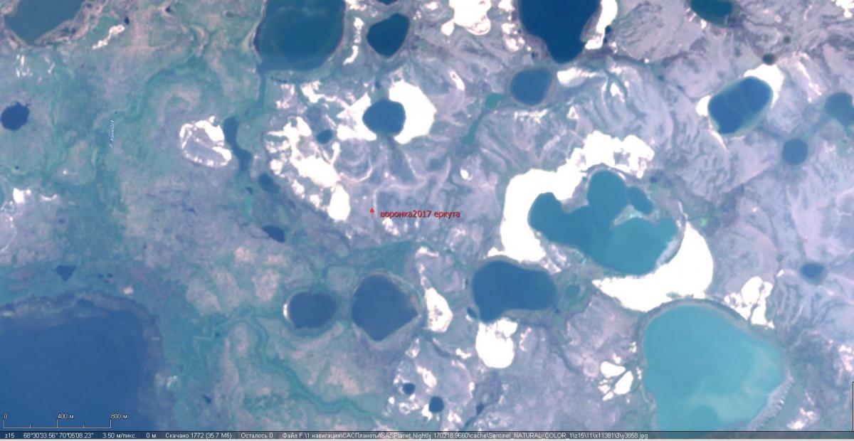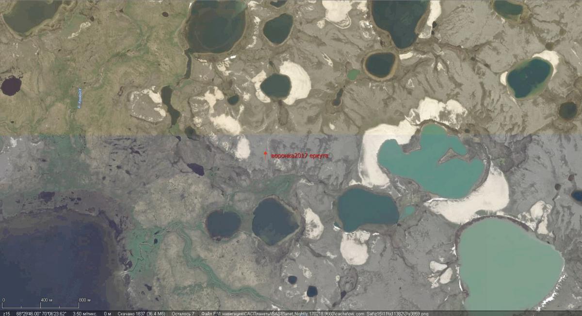 На Ямале сейчас всё чаще и чаще обнаруживают воронки, и та которой интересуюсь образовалась в 2013 г по словам оленеводов. Только сенсации по ней не делали, злых духов испугались тогда )).мы кажется ещё одну воронку на Ямале нашли. Вот координаты N70° 08' 40.2" E68° 29' 45.4" (wgs-84)