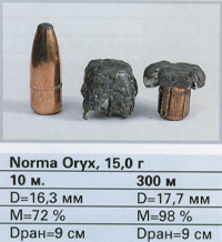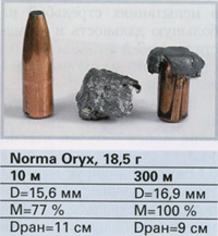 Фирме Norma, создавшей пулю Oryx, удалось разработать пулю, которой оказалось возможным стрелять с предсказуемым результатом даже на большую дальность, причём как тяжёлой, так и лёгкой версией пули. По критерию точности пуля Oryx массой 15 г несколько уступала, зато если бы оценка давалась только по настильности траектории, то она безоговорочно заняла бы первое место.