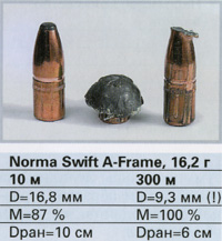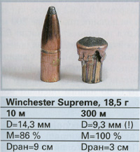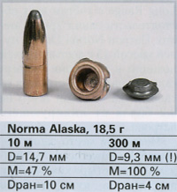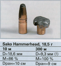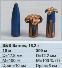 Результаты сравнения вариантов снаряжения при стрельбе на большую дальность сильно отличаются от итогов сравнительных испытаний стрельбой на нормальную дальность. Причиной этого было, в частности, то, что некоторые пули вообще не деформировались в цели. Другие на больших дальностях показали настолько большиепонижения траектории, что стрельба на 300 м становилась проблематичной, даже если пуля попадала в цель и деформировалась. Тем не менее, часть патронов на дальности 300 м оказалась приемлемой как в отношении скорости деформирования, точности, так и настильности траектории. Следовательно, и в этом калибре тоже можно обнаружить пули, подходящие для стрельбы на большие дальности.