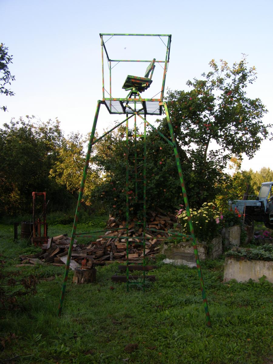 Я вот почитал, посмотрел варианты, и за три дня родил...Высота до пола 2,95 м., выста поручней, собственно упор для карабина - 3,90 м. Устойчива, не скрипит, разборная, один человек за три ходки справится, хотя для меня это не актуально. Буду пробовать.P8174671.jpg