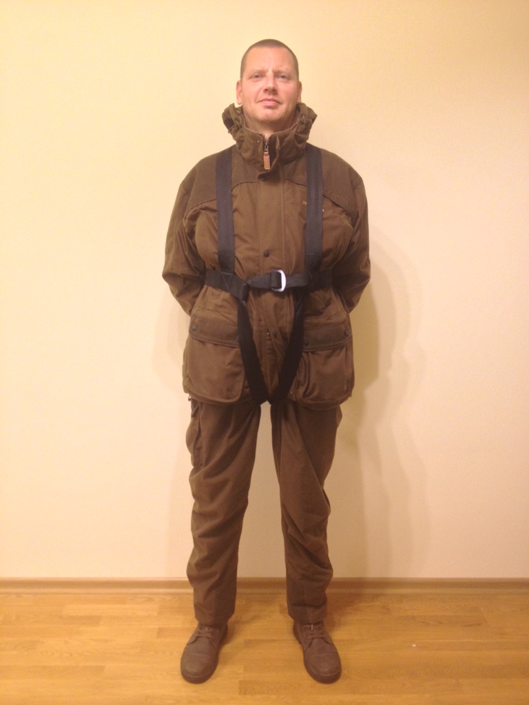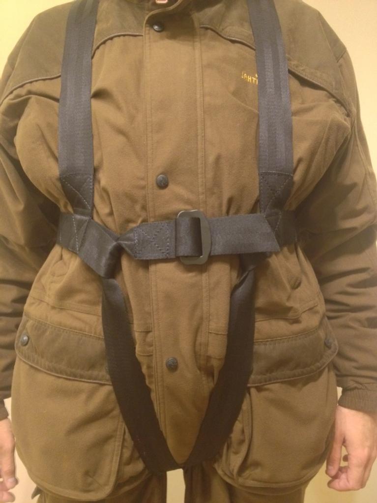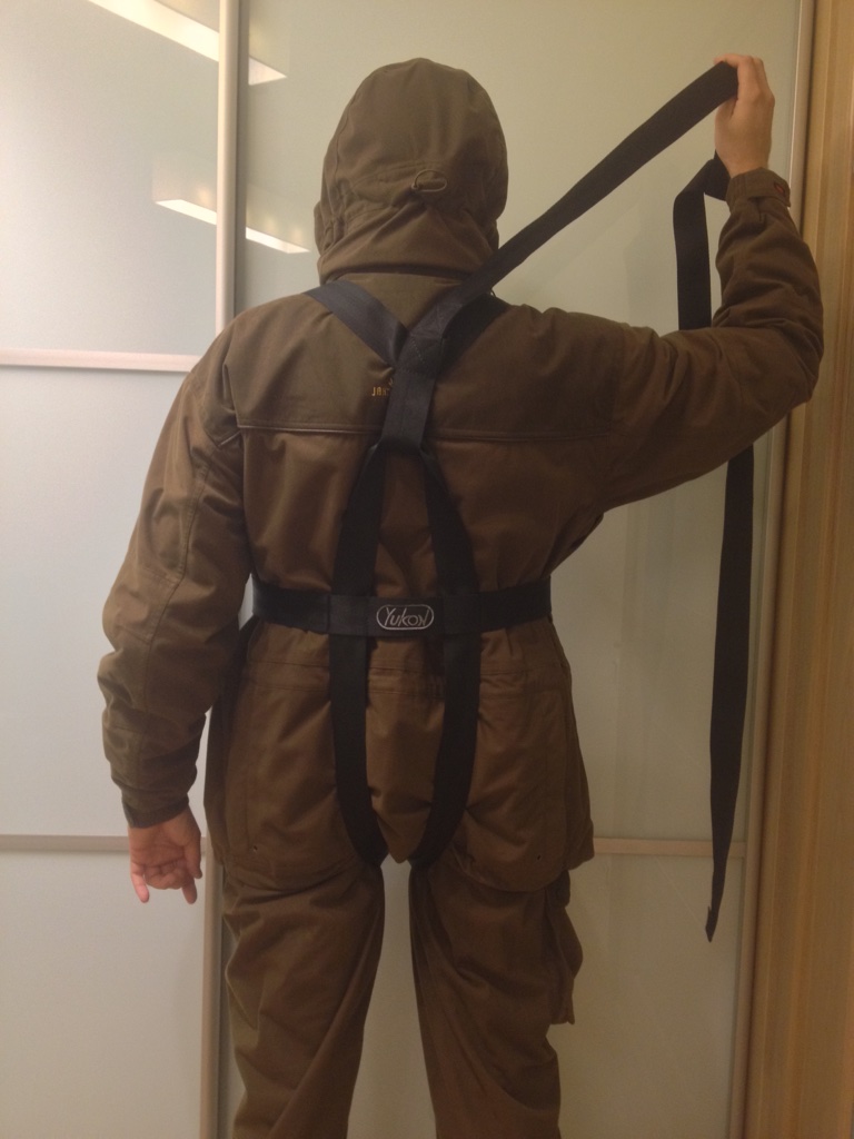 Ребята по моей просьбе разработали обвязку всего с одной пряжкой (на поясе), чтобы не брякнуть в самый ответственный момент.