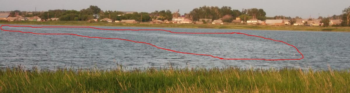 На фото полоса обведена красным. Тянутся они от берега до берега(примерно в километре от сфотканой есть ещё одна, почти параллельная, только выгнута в обратную сторону, грубо говоря, они образуют разорваный в 2 местах овал), соответственно, проходят по местам с разной глубиной.