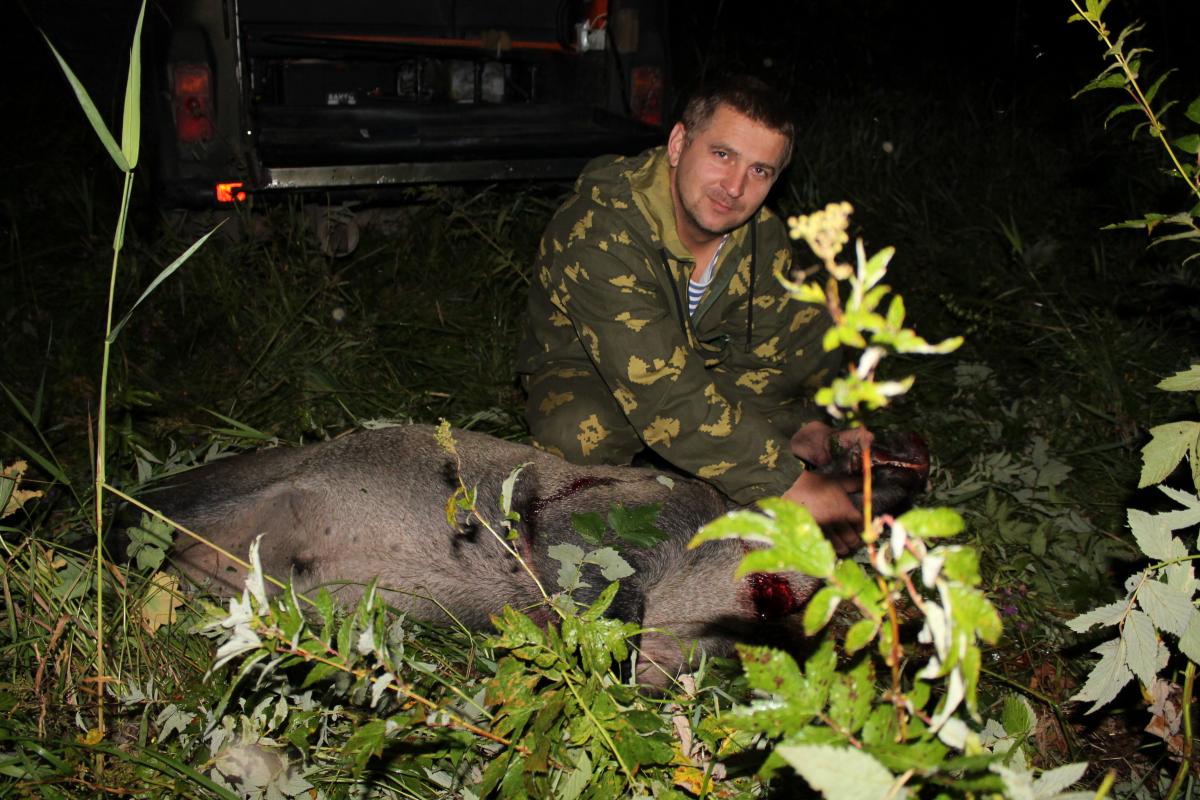 23.30: появляется силуэт, проводится на мушке 4-5 метров, выстрел! Кабана подкинуло и брякнуло. Минута предсмертной агонии и всё.