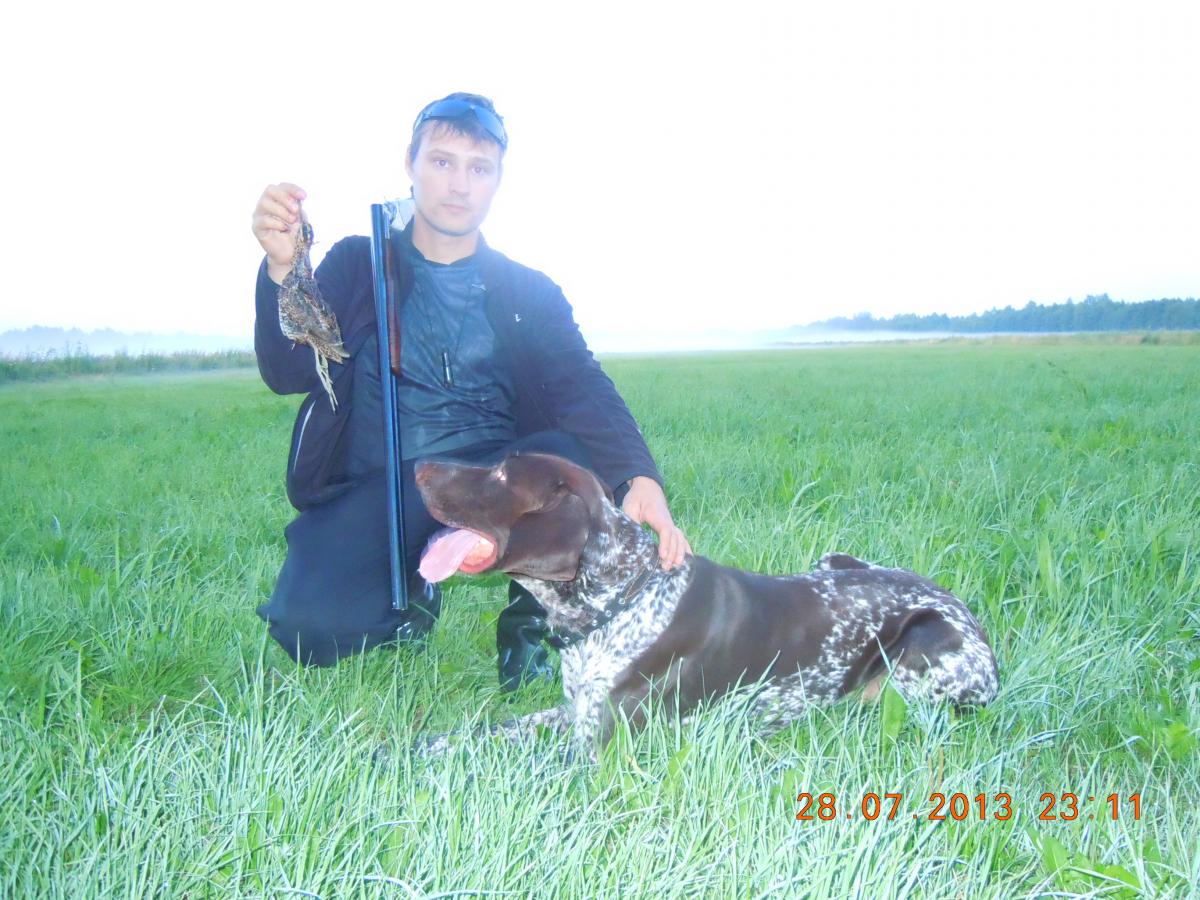 Собака тяжеловатым галопом начинает челночить, то и дело пытается поймать ветер и задирает голову, оттого челнок немного неровный. Ряд поправок, проходов вместе с собакой и результат достигнут. Видимо начало пахнуть птичкой, и не понимая точно откуда, собака вынуждена сократить глубину челнока и несколько ширину. Именно эта манера и приносит нам первую стойку. Резко развернувшись на параллели собака замерла в напряженной стойке. Подойдя ближе я заметил как судорожно сокращаются мышцы на задних лапах, сломал ружье, вставил один патрон. Подхожу, собака чуть протянула и снова замерла. Дай! и впереди метрах в 6 и чуть левее чутья взлетает наш любимый кулик. Собака застыла и смотрит в след улетающей птице, вскидываю ружье, неторопясь выцеливаю, выстрел - шлепок об землю.