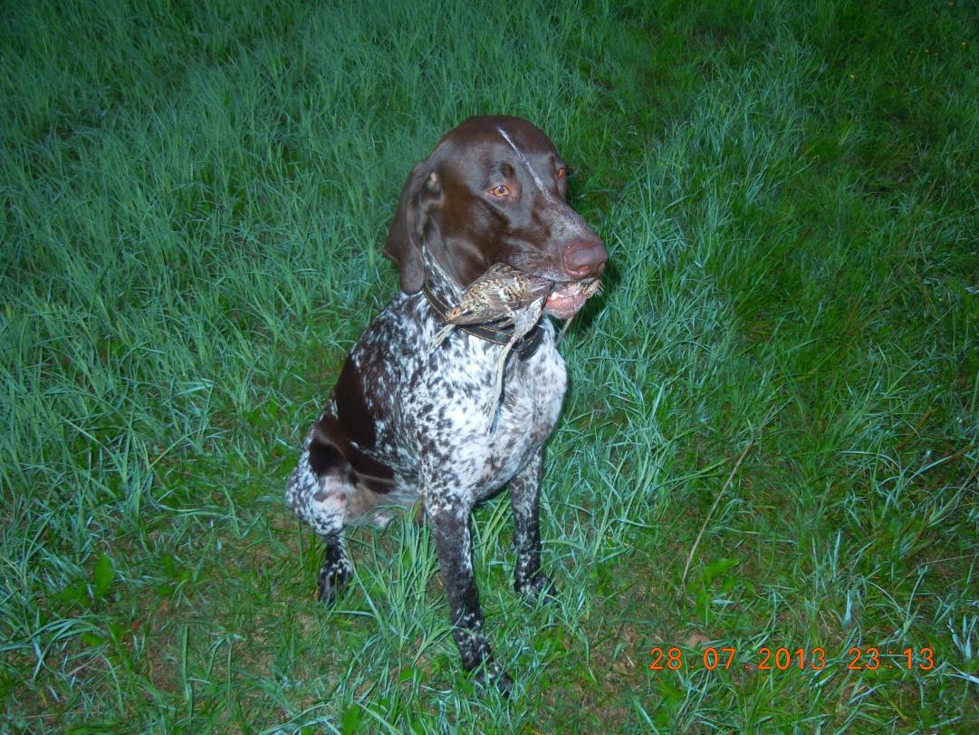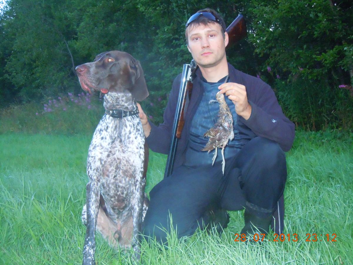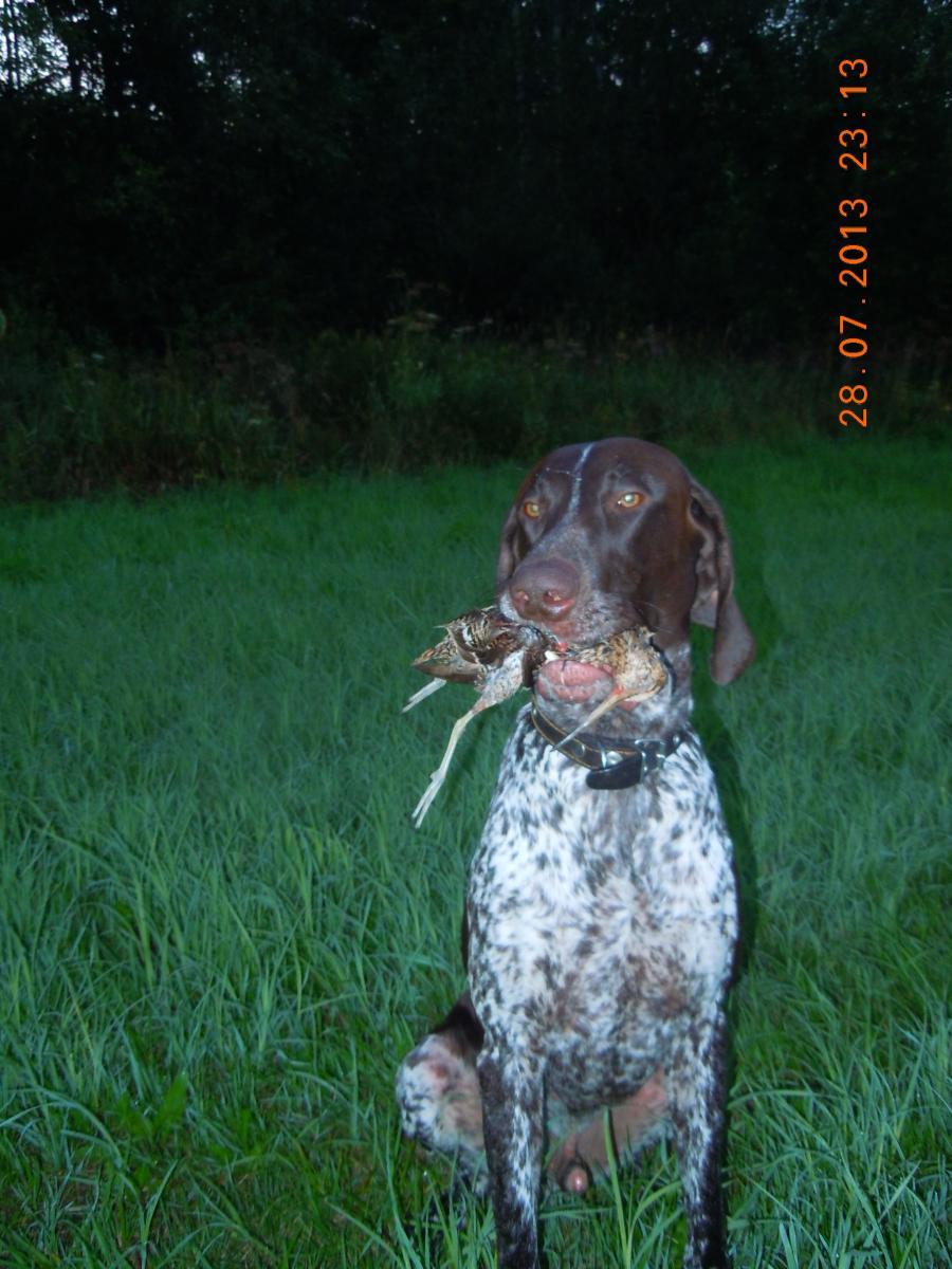 Снова появился запах, собака сбавила ход, присотановилась, стойка я направляюсь к ней, потяжка, стойка, снова потяжка и дупель улетает прочь ) собака плюхнулась на попу и смотрит на меня. толи понимая что все не так, толи не понимая почему я не стрелял. Игнорирую эту работу. Снова пускаю в поиск.