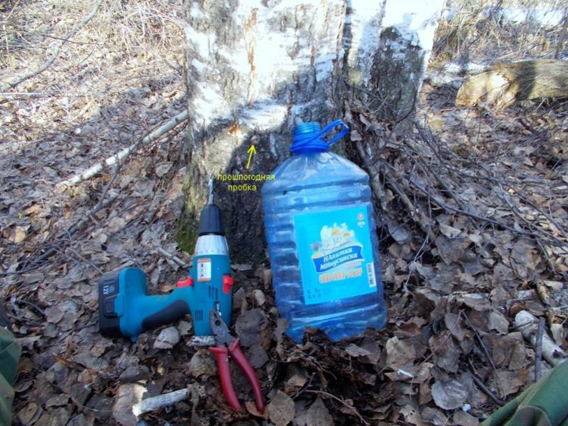 Вот в чём секрет: у нас отверстие 6 мм., берёзы не на опушке а в лесу. Будем менять тактику.На стороне опушки засверлить, трубку завернуть на "закрытую" сторону дерева и там поставить бутыль.