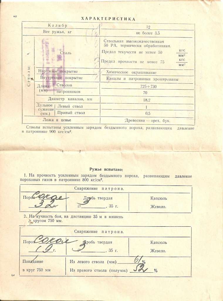 Готовое ружье испытывали специальными патронами. Стандартное испытание каждого ружья проводилось усиленным зарядом бездымного пороха "Сокол" 3.2-3.3 г и навеской 35 г дроби. При этом ружье выдерживало испытательное давление 800 кг/см2 (позднее до 850 кг/см2). Кроме испытательного отстрела проводилась также проверка кучности. Иногда в паспорте указывалась весьма невысокая кучность, менее 45 и 55%. Это объяснялось применением при испытаниях мягкой дроби. Ружья, испытанные патронами с твердой дробью, показывали кучность примерно на 10% лучше. Экземпляры ИЖ-54 со стволами 750 мм имеют высокую равномерность осыпи и показывают современными патронами с контейнером (Тайга, Техкрим) кучность 55-65% из получока и 70-75% из чока дробью №5. Результаты отстрела, тип покрытия стволов, тип и древесина ложи, вес стволов и ружья в сборе заносились в паспорт. В некоторых паспортах встречается фамилия мастера-сборщика, во всех есть подписи начальника цеха и начальника бюро цехового контроля. Обратите внимание - это паспорт рядового ружья!