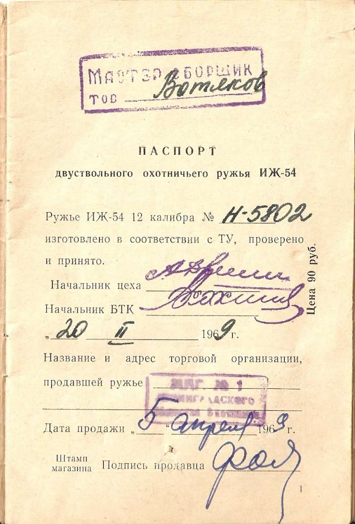 Паспорт ружья ИЖ-54 выпуска 196х г.