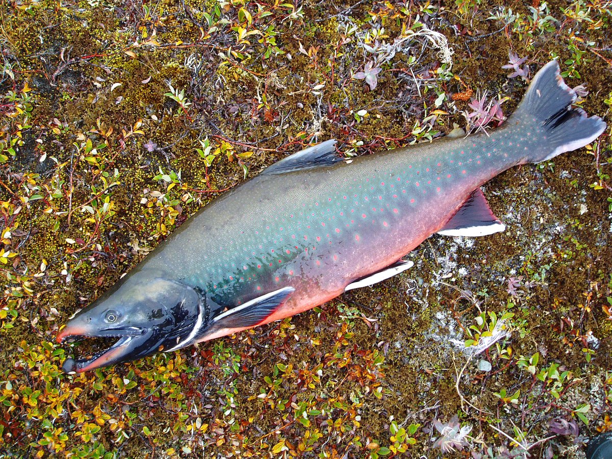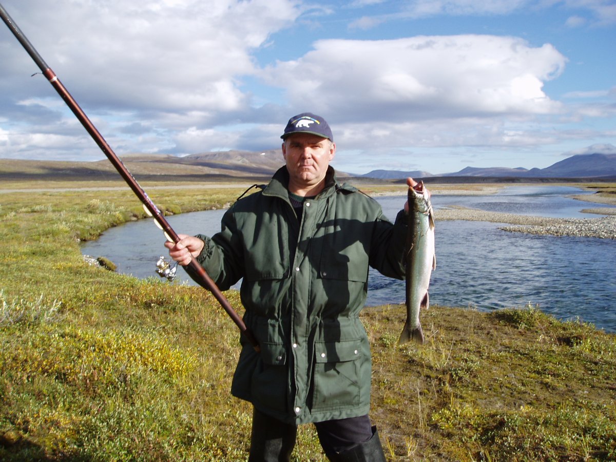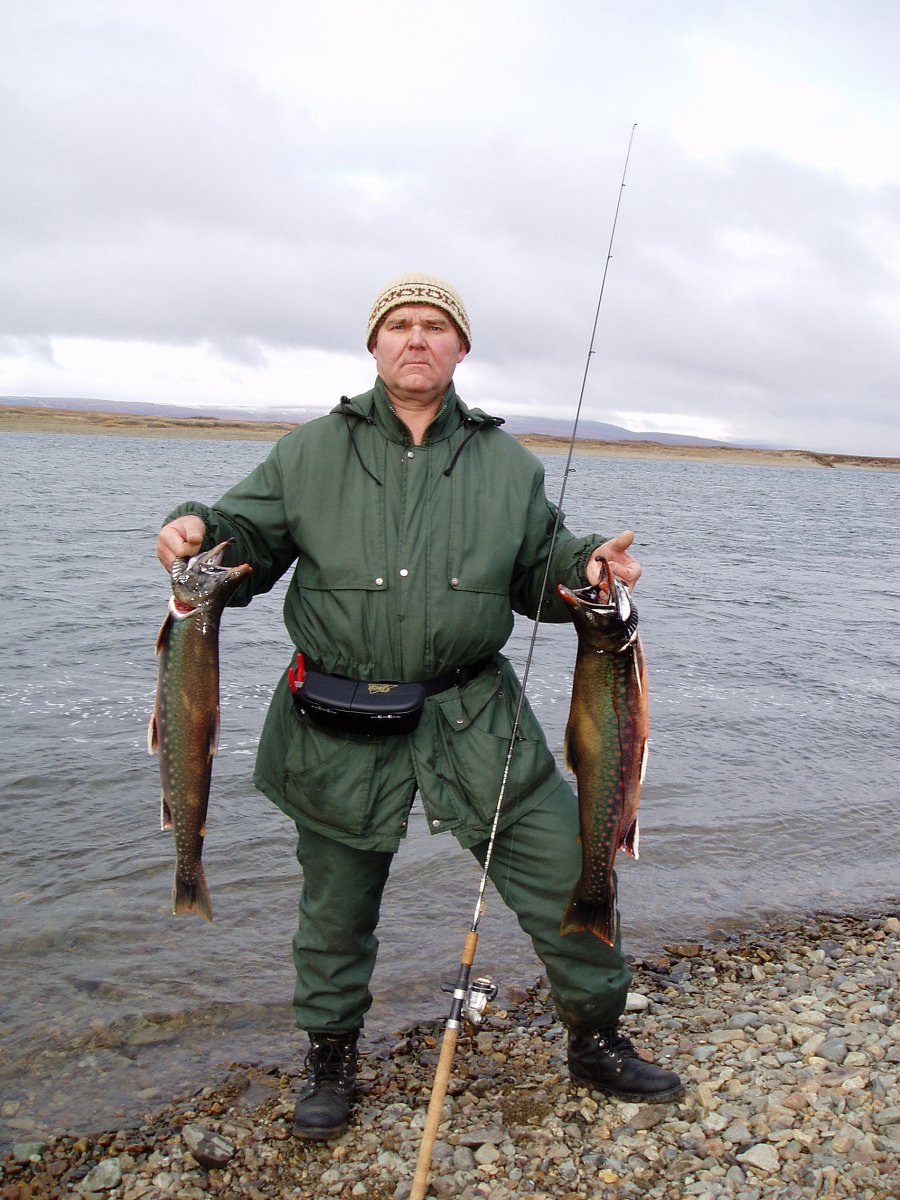 Харитон удочкой,арктический голец ,спиннинг.Это тот кого норвеги называли семгой и выращивали искусственно.(на фото дикий)В основном самочки до 6кГ,самцы до 8кГ,самого крупного которого поймал я ,самец 14кг,на колебалку с ладонь на р.Амгуэма....очень тяжело было.