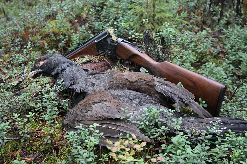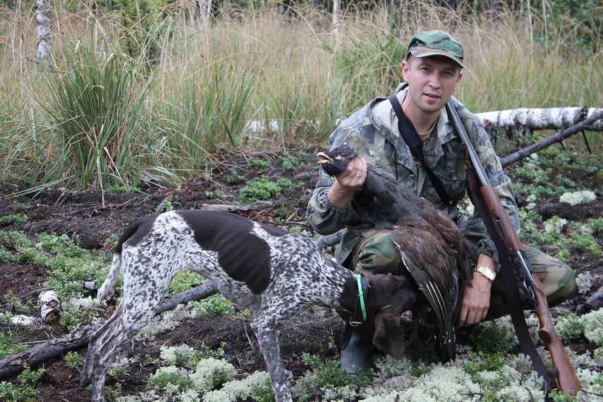 Ночью он спал сладко, и лишь назойливый будильник опять потревожил Митькин сон. Сегодня он решил проверить дальнее моховое болото, с порослью терпкого богульника, клюквы и брусники. Погодка благоволила – пасмурно, тихо, без дождя то, что доктор прописал. Память не подвела, и через час Димка шел по мягкому зеленому ковру, усыпанному алыми и бордовыми крупинками ягод. Здесь он не был несколько лет, меленькие сосенки поднялись, появился подлесок, мешающий просмотру. Глухари сейчас на ягоднике – самое то. Митяй крался как кошка, ловко прыгая меж клюквенных кочек, собачка тем временем, носилась как слон впереди, сводив на нет все его усилия. Вдруг Лора припустила, и из-под неё взлетает целый выводок тяжелых птиц. Они замелькали в сосенках своим черно бурым оперением. Далековато, идут на уход, стрелять некуда. Димка понял, что так он мошника здесь не возьмет, нужно менять стратегию. Митяй ушел в левый край болота, на границу корабельных сосен и мелколесья, охотник махнул собаке вправо, как при поиске челноком и, идя по опушке, постоянными жестами не давал ей вернуться к нему, заставляя последнюю идти параллельно себе в метрах пятидесяти. Мягкая кошачья походка охотника со стороны смотрелась причудливо, он быстро просасывался сквозь мелкие густые сосенки, «облизывая» каждую пушистую веточку, ловко перескакивая поваленные деревья. Он пытался ни на мгновенье не упустить собаку из виду, не потерять с ней контакт, не допустить её приближение к себе. Должно быть, давай родимая, заклинал Митяй напарницу. Вдруг Лора остановилась, задрала нос, пошла в потяжку, встала. Глухарь одиночка громко поднялся из-под неё и пошёл над болотными сосенками к ближайшему, спасительному лесу. Димка замер, мошник летел на него. Охотник подпустил птицу в плотную и резко поднял ружье. Вскидка с выстрелом слилась воедино. Митяй увидел, как дрогнуло могучее тело лесного исполина. Глухарь часто замахал крыльями, дотягивая до ближайшей сосны, сел качаясь на сук. Охотник добавил вторым, уже прицельно. Петух, раздвинул крылья, оперся ими о толстую ветку, но потерял равновесия, завалился на бок и, громко ломая сучья, распластался на мху. Митяй подошел, поднял желанный трофей, буркнул «не тот» и бережно убрал птицу в рюкзак. Он оглянулся вокруг, собачка сидела рядом, из усыпанного ягодой болота уходить не хотелось. Димка достал из кармана пакет, начал собирать ягоды дочкам, осмысливая происшедшую охоту, и через пару часов счастливый отправился восвояси.