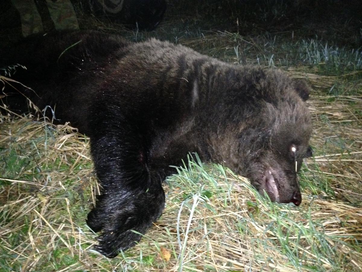 Подошёл в штык, взял в пасть овса, развернулся, пошёл с поля. Ух ты, уйдёт! Нет, на краю поля сел, жуёт. Сел на задницу. Снова пошёл на поле. Правым боком. Так, можно стрелять, вот горб. вдох, выдох, спуск. Нет, стой! Лапы не вижу. Отставить! Ху-ух... Ладно, сижу. Так расслабь правую руку, а то можно замазать, положи карабин на перчатку, а то ещё подпрыгнет - ок, сделано. Видно отлично, как днём, супер! Подошёл на поле, взял овса. Отошёл обратно, сел опять жуёт. Так.., спокойно, медвежат нет! отлично! Встал пошёл, теперь левым боком, но ещё не боком, градусов под 45. Ждём. Вижу прогалину между овсами, так, вот тут будет видна лапа. Должна быть видна, замечаю деревце, чтобы потом найти место стрела, идёт. Подвернул левее, блин, пока неудобно, осталось 5 шагов до прогалины, 4, ну.., повернёшь вправо? 3, да подвернул, но пока недостаточно, 2... Один.., повернул!!! Спуск, выстрел! Ночник чуть засветило, но тут же вижу его, улепётывает! Чуть левее. Так, спокойно.., я вижу зверя и он бежит.., затвор, вкладка.., слуск! Выстрел. Всё. Убежал. Не видно.