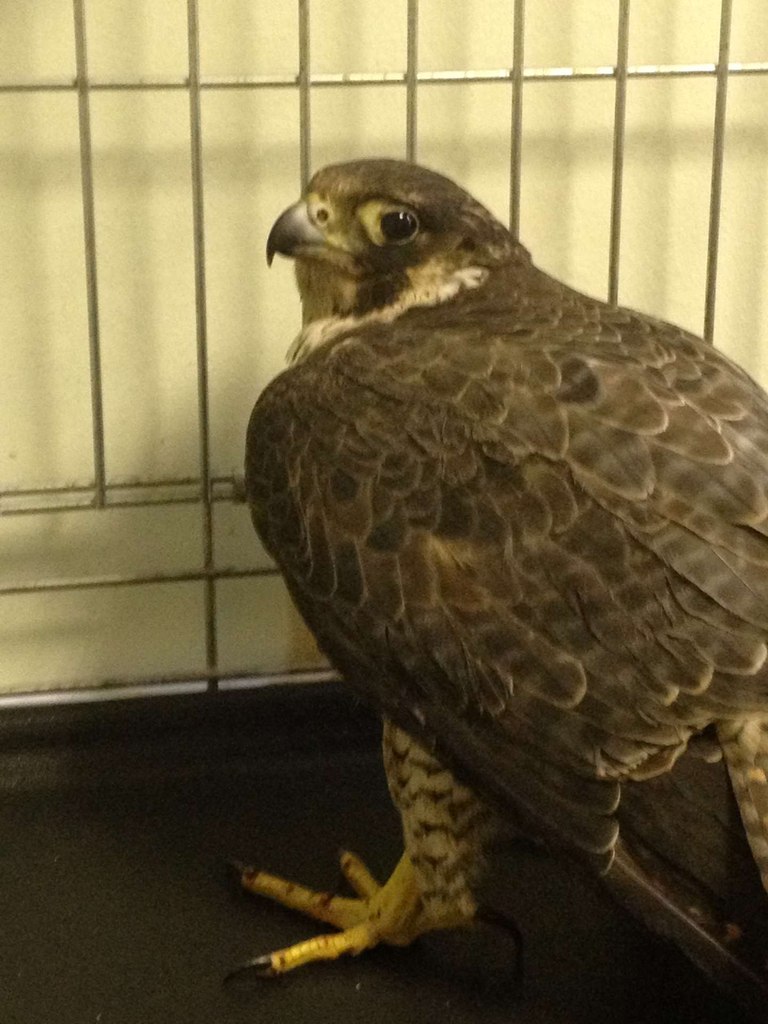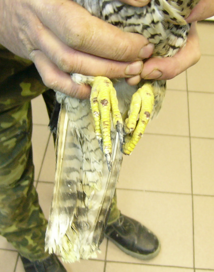 Судя по струпьям на лапах, у сокола может быть оспа. Так что аккуратнее там с карантинными мерами.