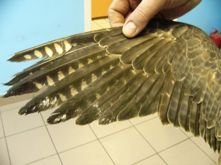 1. Состояние старых маховых перьев больше говорит о содержании птицы в неволе, однако новые, после летней линьки, на удивление все целы. Ну разве что в помете испачканы, но это может быть и свежий помет. Хвост вроде цел.