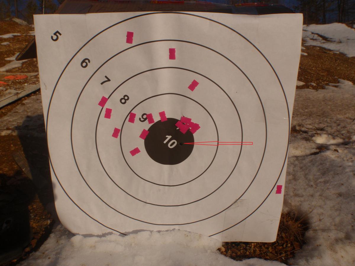 Фото к сожалению, одно, бо время поджимало, солнце садилось, про фотик совсем забыл, вспомнил только когда уже закончил стрельбу. Да и показать особо было не чего, т.к. на кучу стрельба не велась и даже и не собирался, нужно было привести карабин к нормальному бою, что и было сделано. Удивил кентавр - минуту из 4х выстрелов делает. Сами ощущения от стрельбы неоднозначные, карабин сильно лает, дерётся, лёгкий всё таки, ствол ощутимо греется, бо тонкий, почему стал на 300 стрелять по 3 выстрела, потому как в серии из 4х один всегда уходит в отрыв. В дальнейшем думаю заморочиться установкой ДТК, что бы ствол не бросало, а то хоть и 308й, а из-за небольшой массы карабина ствол подбрасывает весьма ощутимо. Ну вот пока и всё. Магазин запасной нужно однозначно! Эту маленькую пластмаску уронишь в глубокий снег - хрен найдёшь!