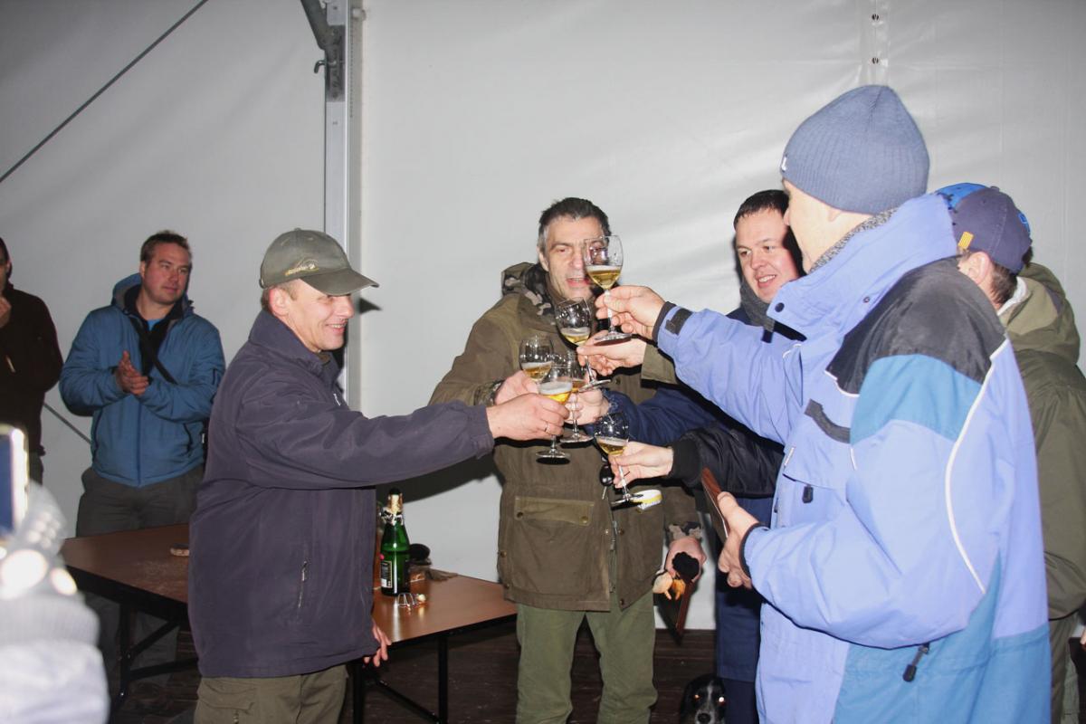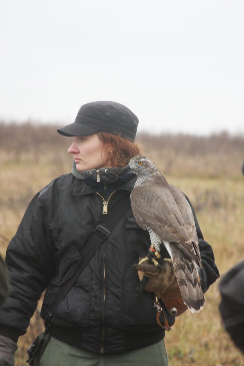 По просьбе телевизионщиков был сделан показательный выход сокольника на высаженного фазана, со стойкой пойнтера и удачной атакой ястреба тетеревятника