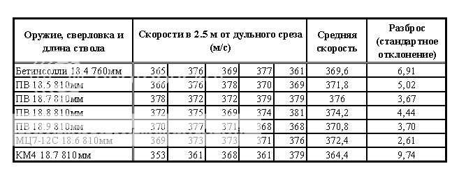Ниже результат небольшого теста, проведенного с целью выявить зависимость между диаметром сверловки ствола и начальной (V2,5) скорости дробового снаряда.