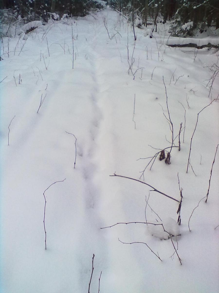 Вчера проверял капканы на реке, домой пришел в пол-пятого. Сегодня с утра пошел туда же-какой то след поверх моего. Свернул (я), решил пройти по реке, вытекающей из лесного озера. И увидел это: