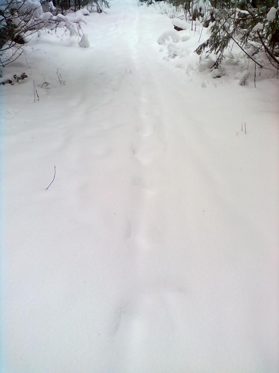Собака моя бегала, бегала, ноль эмоций на след. В одном месте зверь вроде как немного покатался в снегу-тут у моей собаки на роже отразилась небольшая тревога. Нашел помет- длинная какашка сплошь с шерстью лося или кабана.