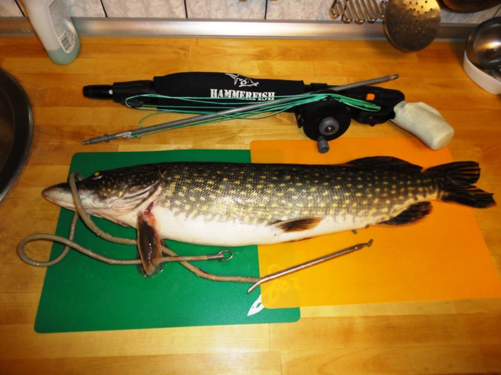 Ночь, улица, фонарь, текуха... После шквалистого ветродуя, готовились к метровому прозраку. Прозрак удивил, 3 метра точно. Уже забыл когда нырял ниже трешки, ныряю с удовольствием. По рыбе, на глубине грустно, но с изменением донного ландшавта стала попадаться щука. Мелкую не стрелял, жалко упущенное время при перезарядке, ждал зачетный экземпляр. И вот она хорошая, выходит справа, показывает бок и начинает уходить. Направляя ружье в ее сторону, понимаю что 50х50, стреляю в уходящую. Щука, и вслед за ней гарпун, скрываются за пределы видимости, как попал гарпун я уже не видел, но по изменению движения хвостовика, и последующей потяжке, понял - сегодня мой день ))). Попал! Да еще точно за жабру, я был в восторге. Попасть в ходовую, с трех метров ... это удача!