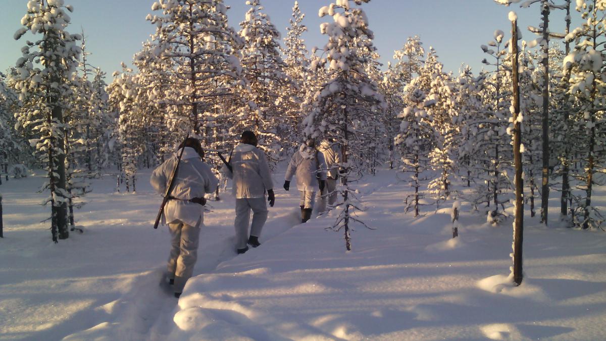 Классная организация охоты!Линия ровная, загонщики почти постоянно видят друг друга, да и тропинки в лесу уже протоптаны.