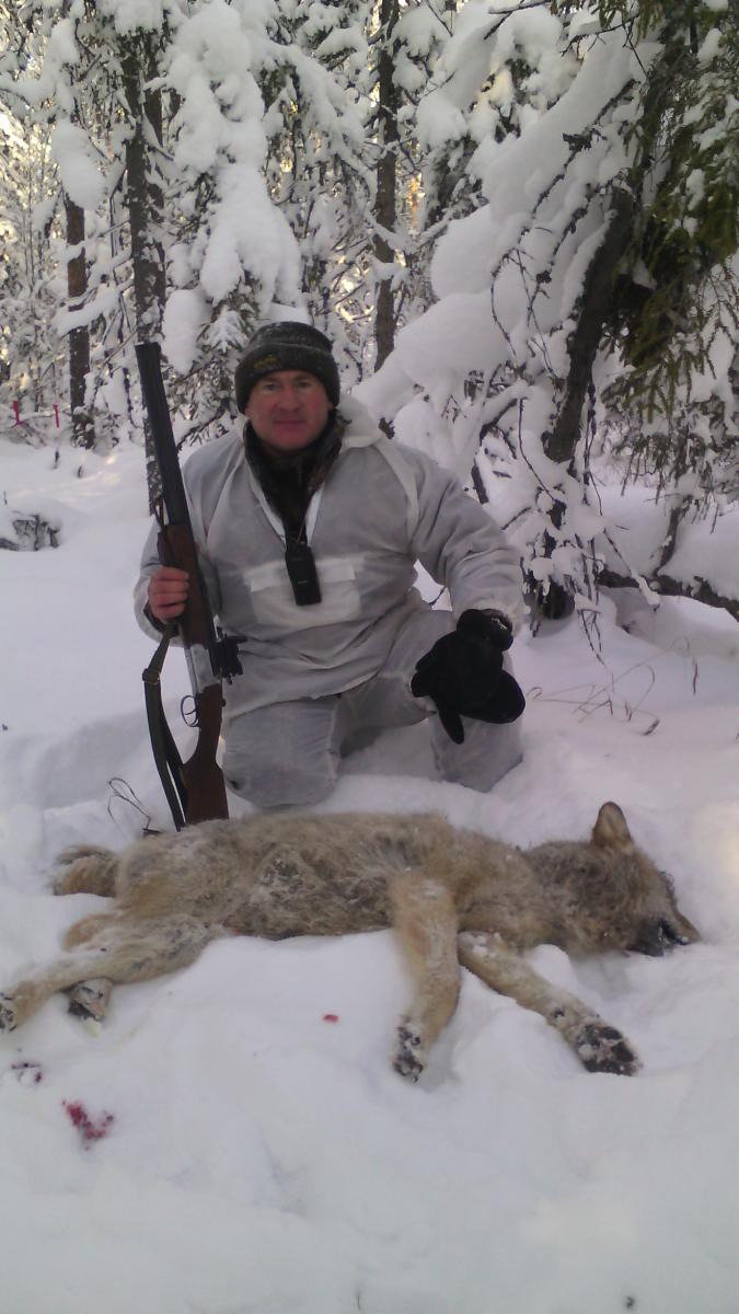 Загонщики вышли к стрелкам сообщив, что 2 волка прорвались сквозь них обратно. Первые два выстрела тоже принесли результат волк отбежал около 300 метров и жизненные силы оставили его.