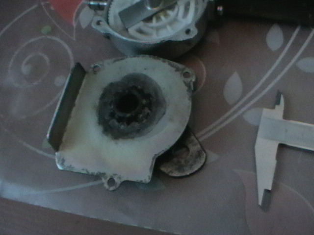 Это фото мотор-редуктора со стороны кронштейна. Пластина размечалась через КРЫШУ (деталь) по маленьким отверстиям. и приварилась к крышке редуктора через втулку высотой 20мм (обрезок водопроводной трубы на 1/2"). Закрутка вытачивалась по гильзе 16 кал., и потом снималась фаска по 12му, и заходная фаска. Внутренние выступы выбивались с другой стороны полностью стальной отверткой. Державку высверливали сверлом на 23мм, у которого были сняты на перьях фаски 2мм*45*.