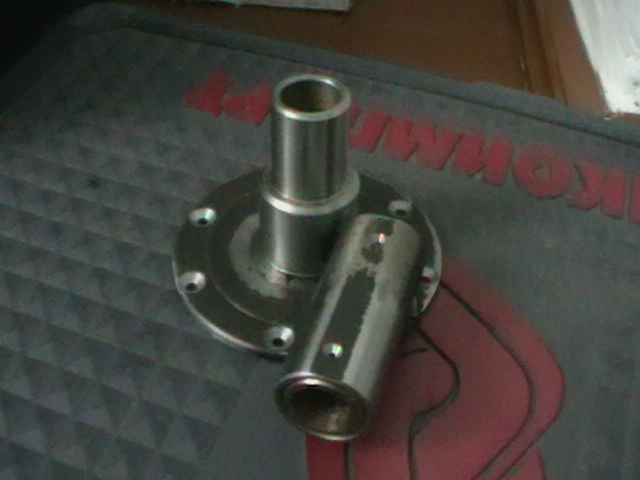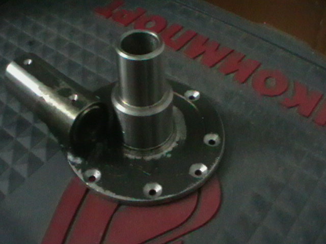 Эта деталь сварная. Сначала к железному блину вырезанному сваркой из листа 5ки просто приварили круглую болванку. потом зажав в станок за болванку обточили блин. Потом зажав за блин обточили и просверлили болванку. потом опять зажав за болванку сделали потай под болт. вторая деталь делалась из шестигранника на 36. под кулачек патрона на токарном станке подложили пластину и просверлив и проточив деталь была отрезана ( да были еще сняты фаски изнутри и снаружи) после отрезания была снята фаска изнутри с другой стороны. потом деталь была обработана на наждаке (сняты углы шестигранника) кроме подставки (той части которая приварена) потом все сварилось.