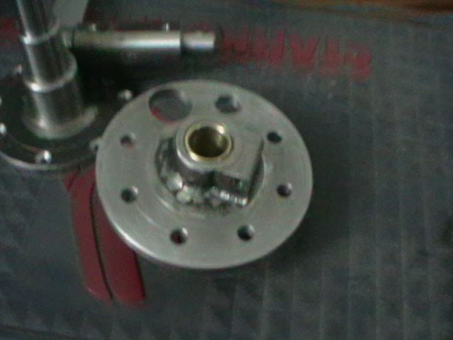 это ползун сделан из стального блина толщиной 10мм D-120мм, по диаметру 90мм размечены 8 центров и просверлены 6 отв. d-8,5мм, 1но 14,5мм, и одно 25мм, и втулки детали сначала сварены потом обработаны. Внутрь запрессованы бронзовые втулки и развернуты разверткой на 20мм.