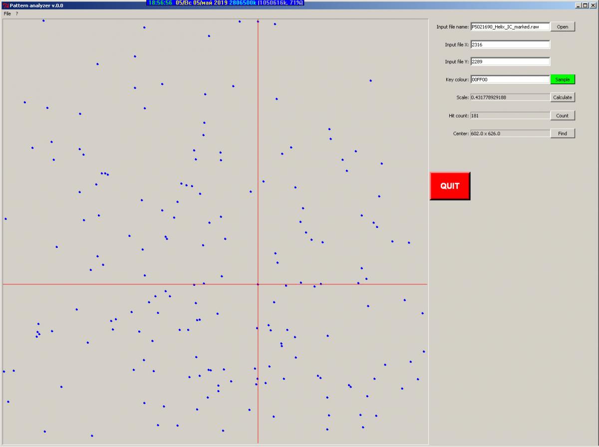 В этом формате изображение представляется просто как одна длинная сопля из байт. Каждые 3 байта - описывают соответственно красный, зеленый и синий цвета для одного пиксела. Таким образом моя программа, читая байты тройками - получает данные о цвете изображения попиксельно. Она тупо перебирает все пикселы в изображении, сравнивая из с искомым ключевым цветом. Когда обнаруживается совпадение то увеличивается счетчик попаданий, а также координаты этого пиксела приводятся с помощью масштабного коэффициента и заносятся в массив координат попаданий. В дальнейшем программа работает уже с этим массивом, а не с изображением.