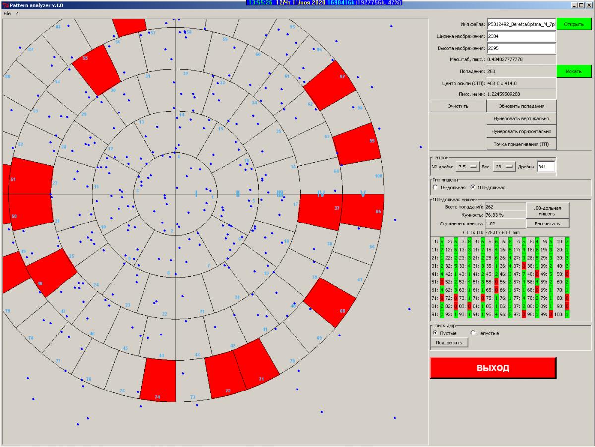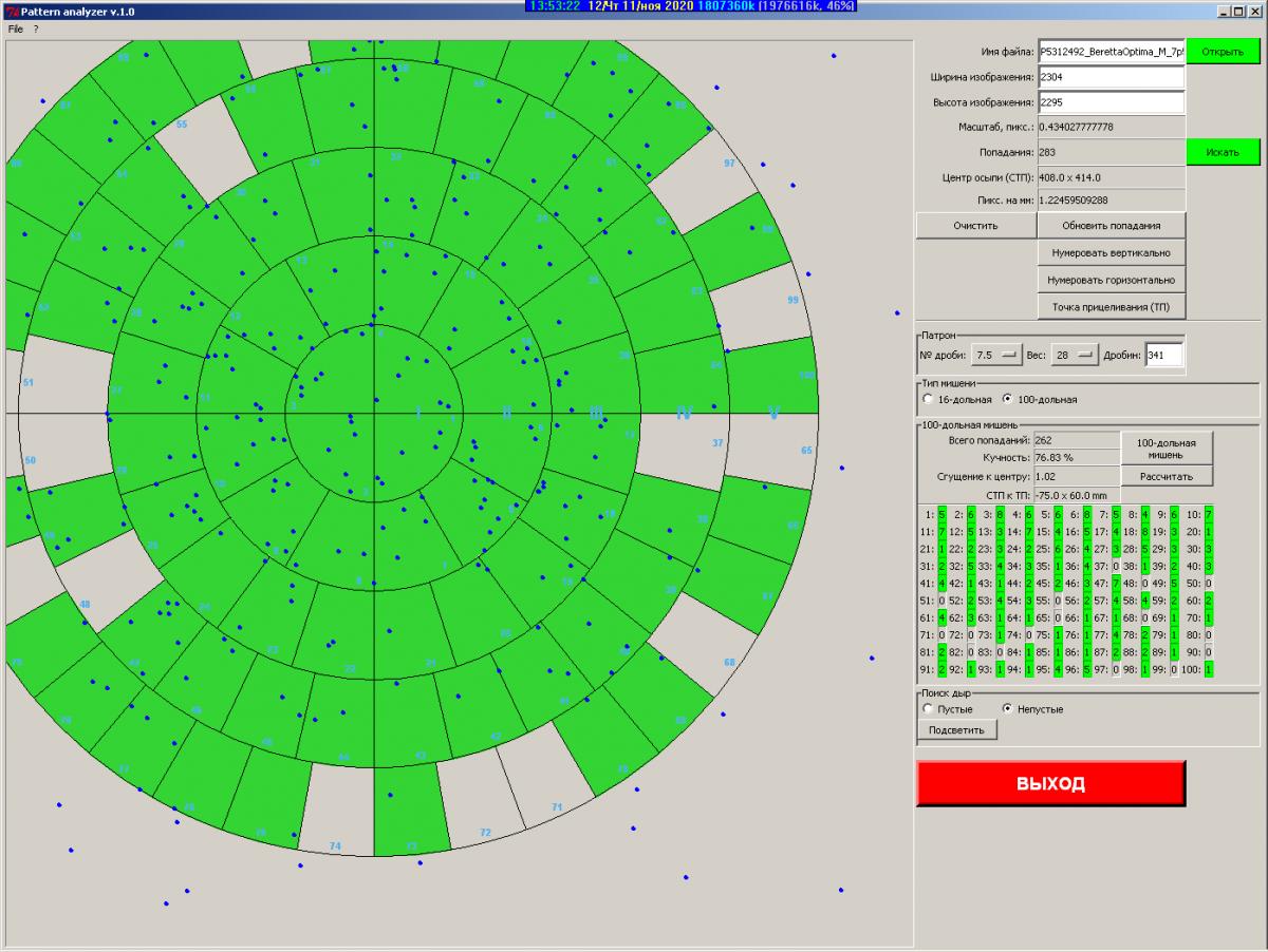 Когда массив координат попаданий заполнен - по нему в графической области размером 1000х1000 пикселов рисуются синие кружочки, символизирующие попадания.