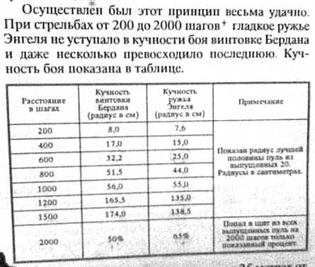 Осуществлен был этот принцип весьма удачно. При стрельбах от 200 до 2000 шагов + гладкое ружье Энгеля не уступало в кучности боя винтовке Бердана и даже несколько превосходило последнюю.
