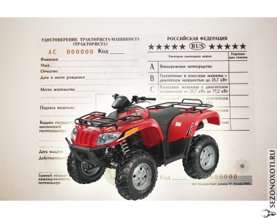 http://sezonoxoti.ru/node/6242 Популярность снегоходов и квадроциклов среди любителей охоты и рыбалки, да и просто путешественников, растёт год от года. Но не все ещё знают, что обычных водительских прав для управления такой техникой недостаточно.Разрешение на управление снегоходом, квадроциклом и другой подобной техникой даёт свидетельство тракториста-машиниста с открытой в нём категорией "А". Процесс получения прав на трактор и квадроцикл одинаков. Помимо сдачи необходимого пакета документов, претендет обязан ответить на вопросы по теории эксплуатации транспортного средства, ПДД, а также пройти практикум по движению - езда по прямой, разворот, змейка и заезд в бокс. prava-na-atv.jpg